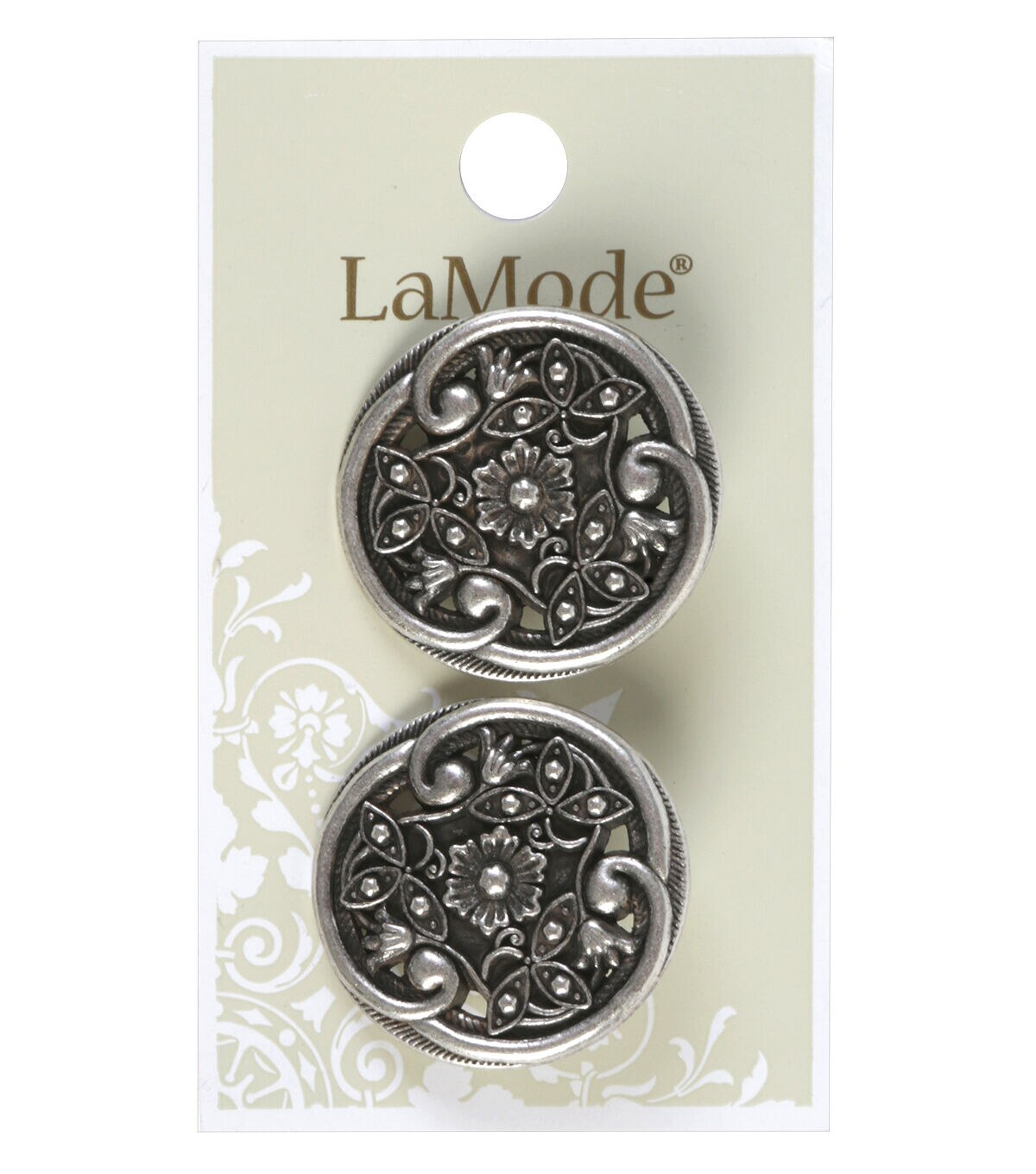 The La Mode Antique Silver Floral Filigree Shank Buttons look beautiful with their engraved design. These attractive filigree buttons will let you prettify handmade dresses, skirts, coats and tops. You can use them for decorative purposes or fastening. Add them to handbags or hair accessories to enhance their look. This pack contains two buttons with a silver-toned finish.