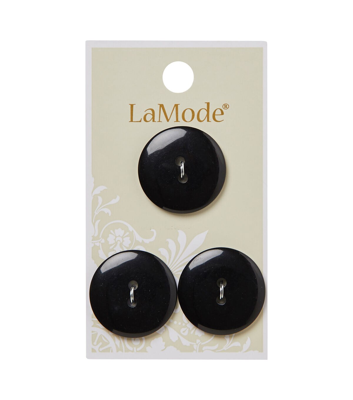 Simple yet elegant, the La Mode 2 Hole Buttons - Black will make a delightful addition to your collection. These buttons sport a black hue and will be perfect for your handmade dresses, tops, shirts and more. You can use them for fastening or decorative purposes. This pack contains three sew-through buttons.