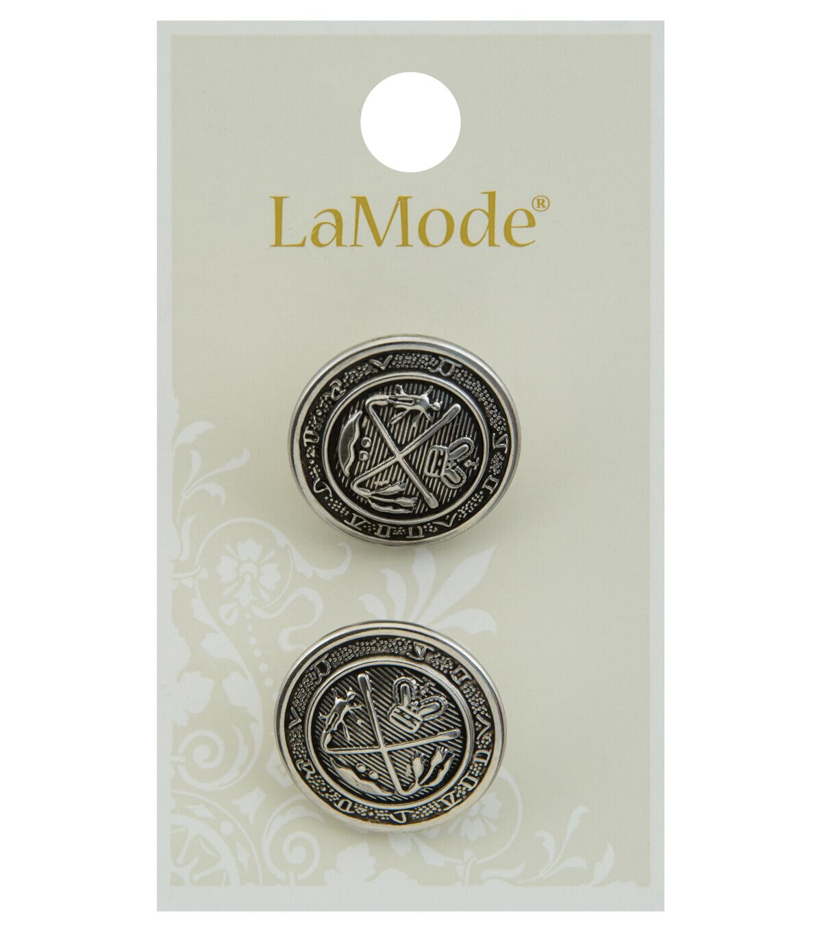 The La Mode Round Shank Buttons Silver will be an excellent addition to your sewing kit prerequisites. Sporting a silver tone with an antique design, these buttons will perk up the look of your garments. Easy to use, they are perfect for dresses, handmade shirts, jackets and more. Brand: La Mode Collection: Apparel Buttons Includes two buttons Size: 0.88 inch Content: Metal Care: Washable & dry cleanable