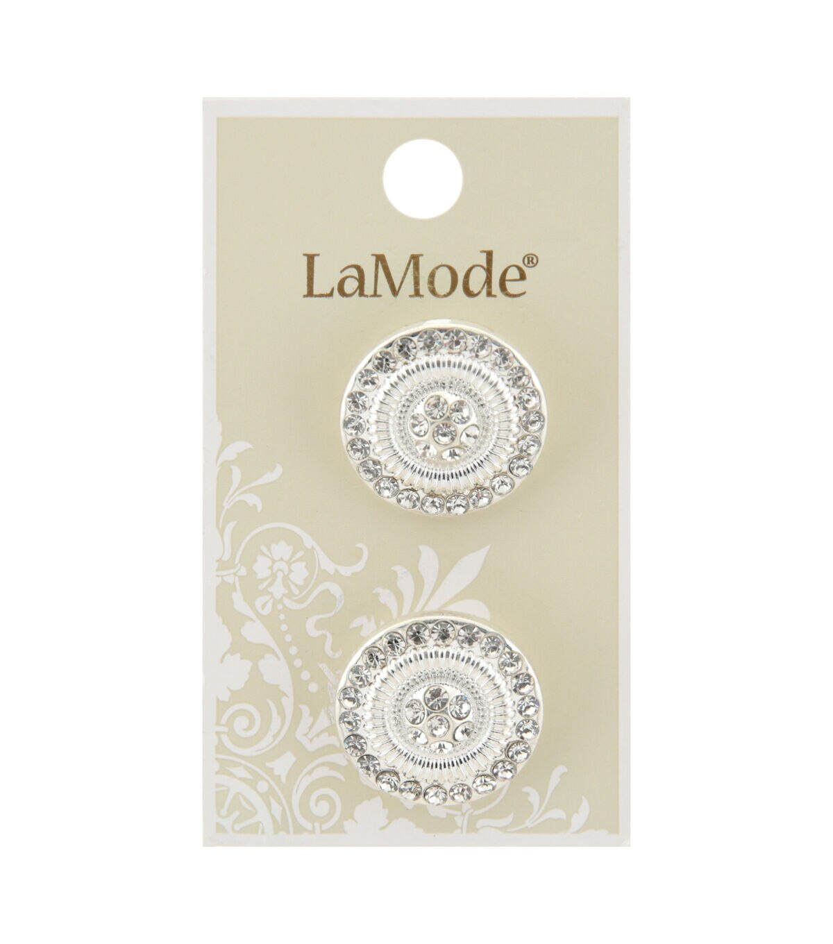These La Mode Silver Shank Buttons with Clear Rhinestones are perfect for everyday sewing, crafting or fashion projects. The 22 mm shank buttons come in a pack of two.