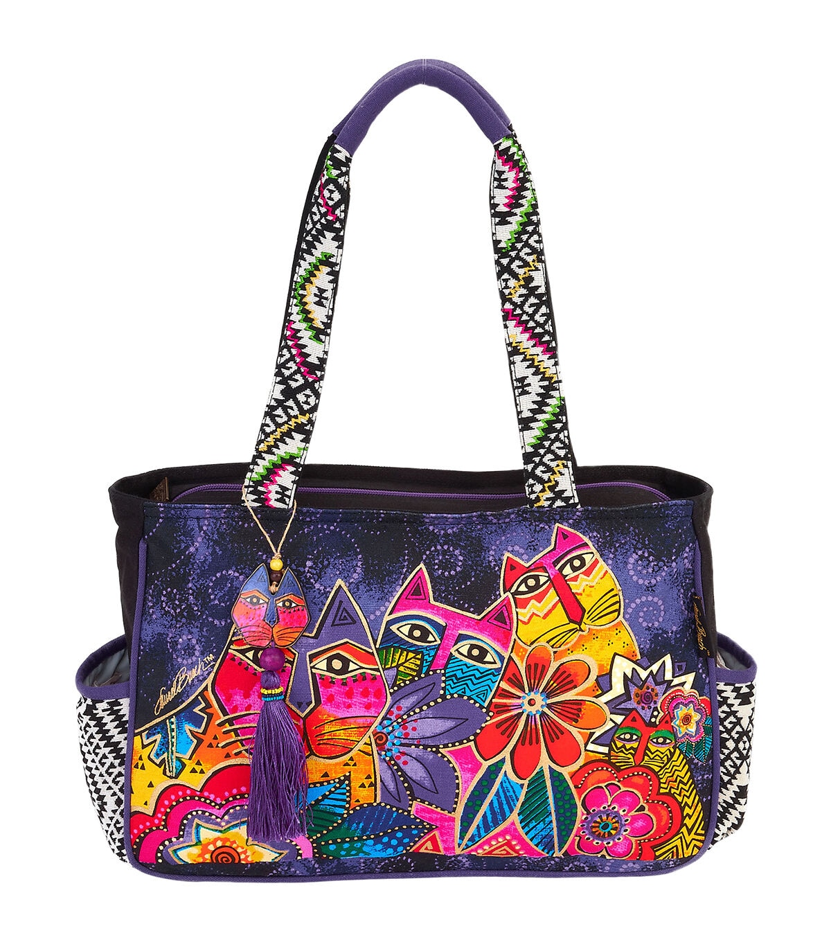 Bright, vivid colors define the signature artwork of artist Laurel Burch. Her totes are designed to be practical and useful art. Use your bag to carry produce from the farmer's market, shopping at your favorite store or taking your latest craft project on any journey. This package contains one 14.5x4x10 inch bag. Imported.