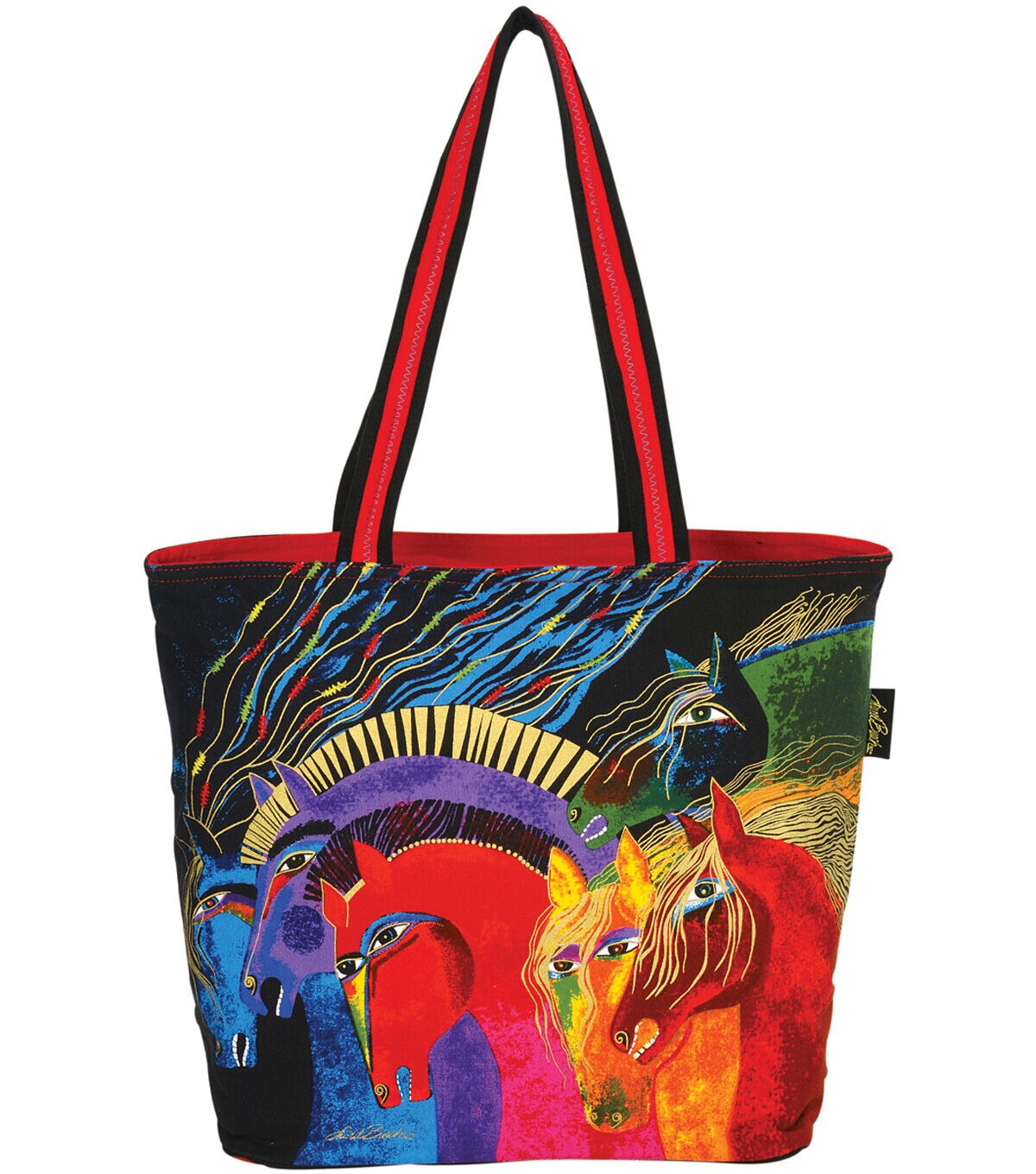 Shoulder Tote: Wild Horses of Fire. These Laurel Burch totes are designed with her magically uplifting whimsical creatures. The bright colors; fun images and the practical construction of these totes make them popular all over the world. This package contains one 15x19x7 inch tote with glitter and bead accent; removable bottom support; inner zipper pocket; canvas straps and a wood charm. Imported.