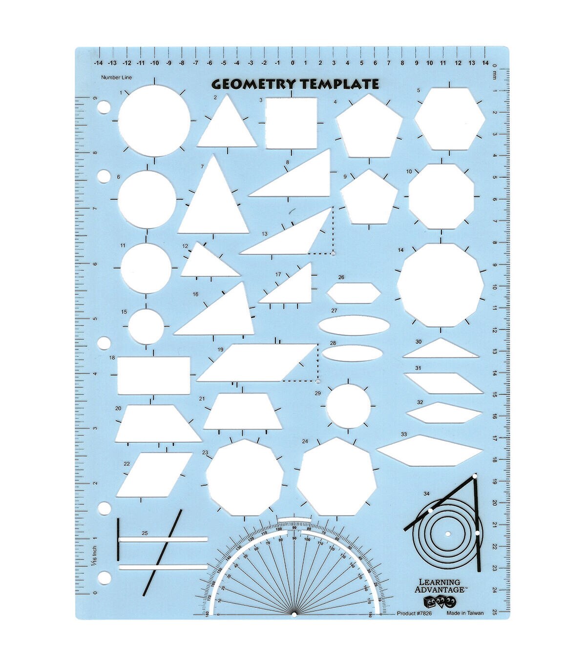 This versatile plastic template features a variety of 2-D shapes, 180 degree protractor, metric and standard rulers, number line, perpendicular-parallel line and more. Measures 7-7/8" x 10-1/4". Ideal for grades K-8. Pack of 6 templates.