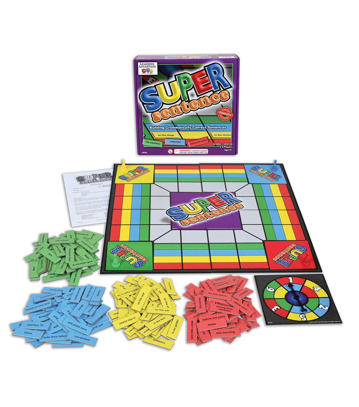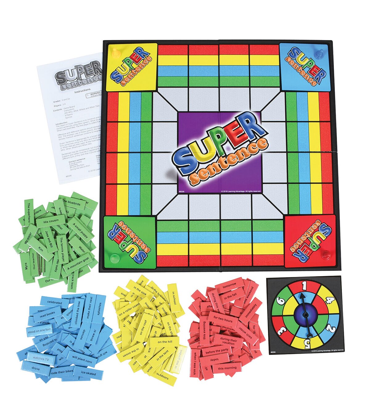 Gather your construction tools—it's time to build sentences! As players spin and move their pawns around the white track, they use who, what, where, and when phrases to build grammatically-correct sentences. Sentences may be silly or serious. The emphasis in on identifying singular and plural subjects, using verbs that agree, and keeping the same tense—past, present, or future—throughout a sentence. The first player to complete five sentences is the winner. Additional suggestions for sorting and writing activities using the tiles are included. For 2-4 players, grades 3 and up. Contents: Game Board with Spinner, Instructions, 200 Who, What, Where, and When Tiles, and 4 Pawns.