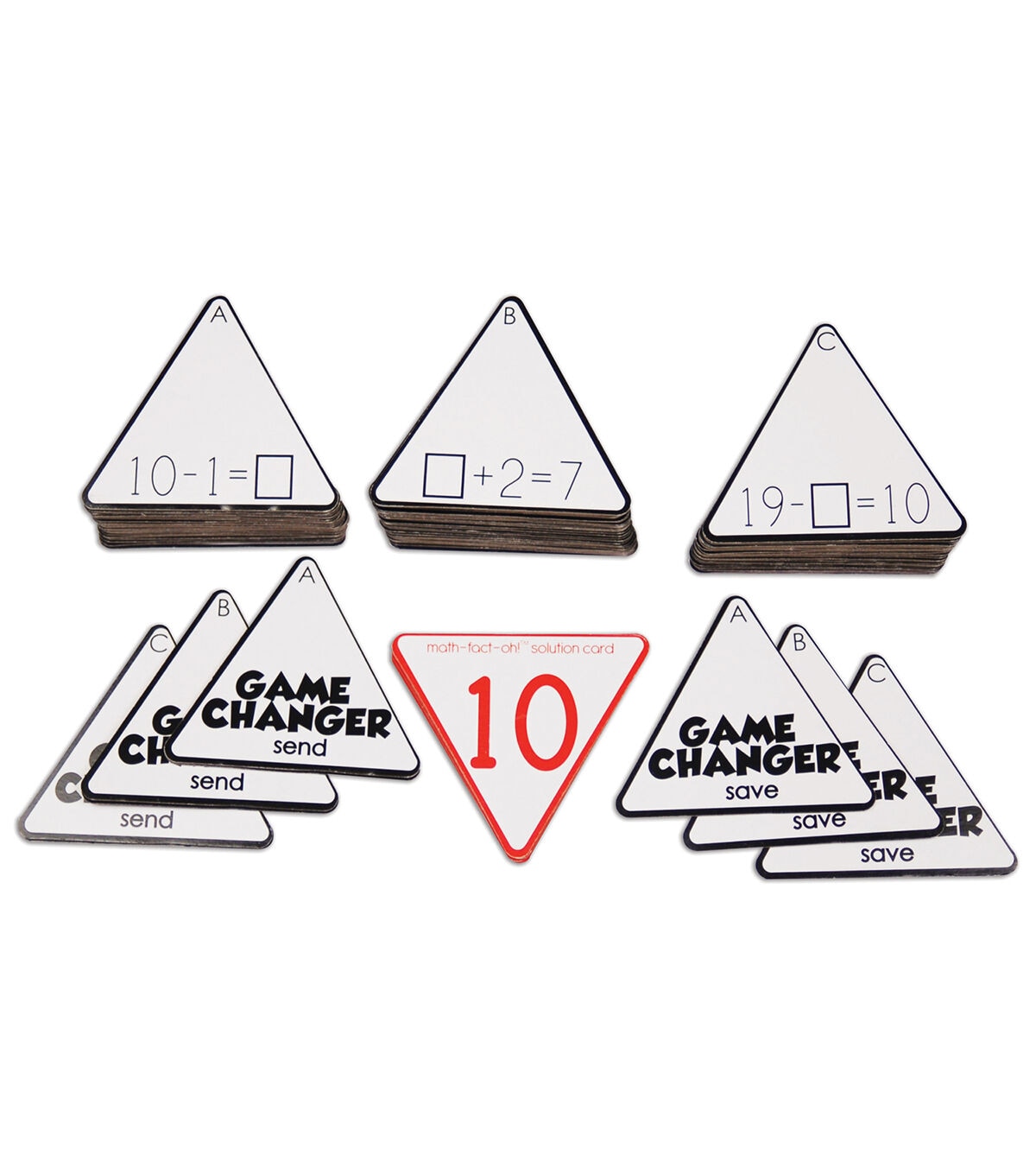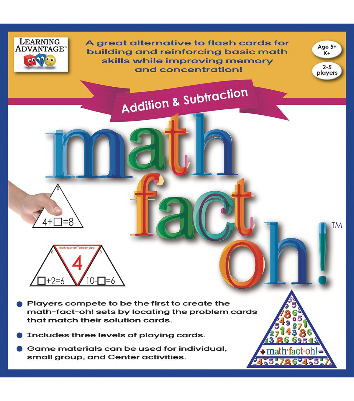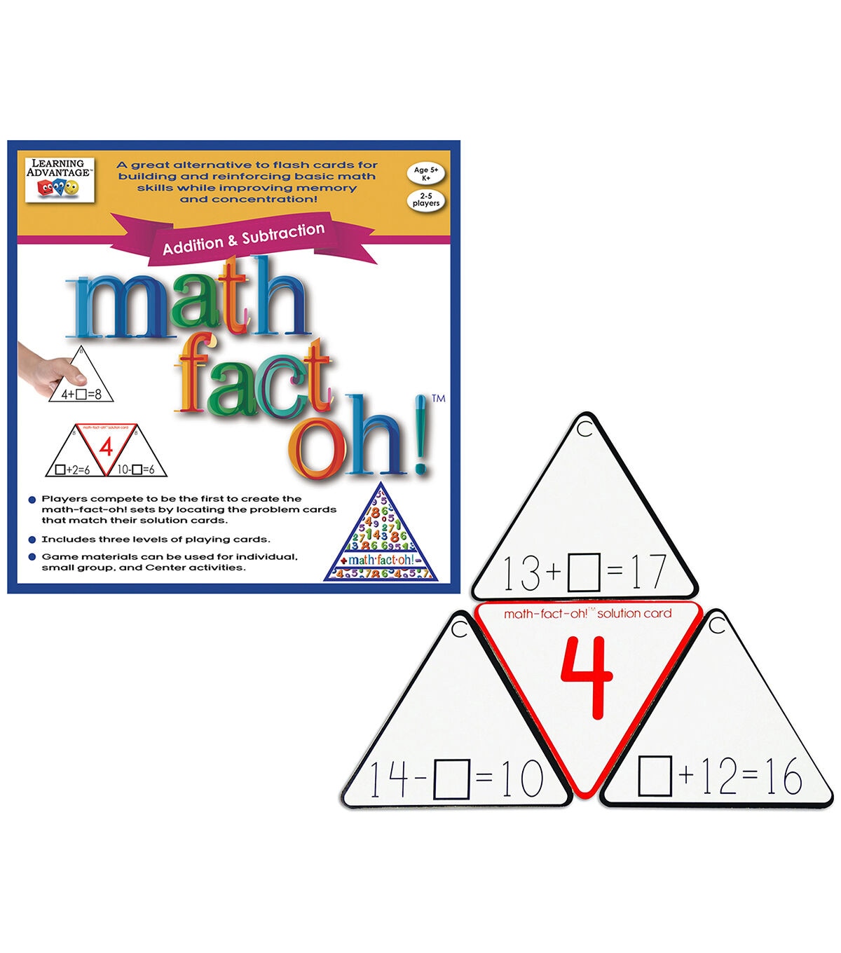 A great alternative to flash cards, math-fact-oh! builds and reinforces basic math skills while improving memory and concentration! For every solution card there are three corresponding equation cards that compose a triangle called a "math-fact-oh!." Players compete to be the first to create the math-fact-oh! sets by locating the addition and subtraction problem cards that match their solution cards. For grades K+.