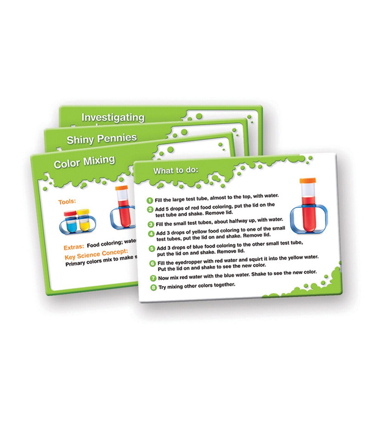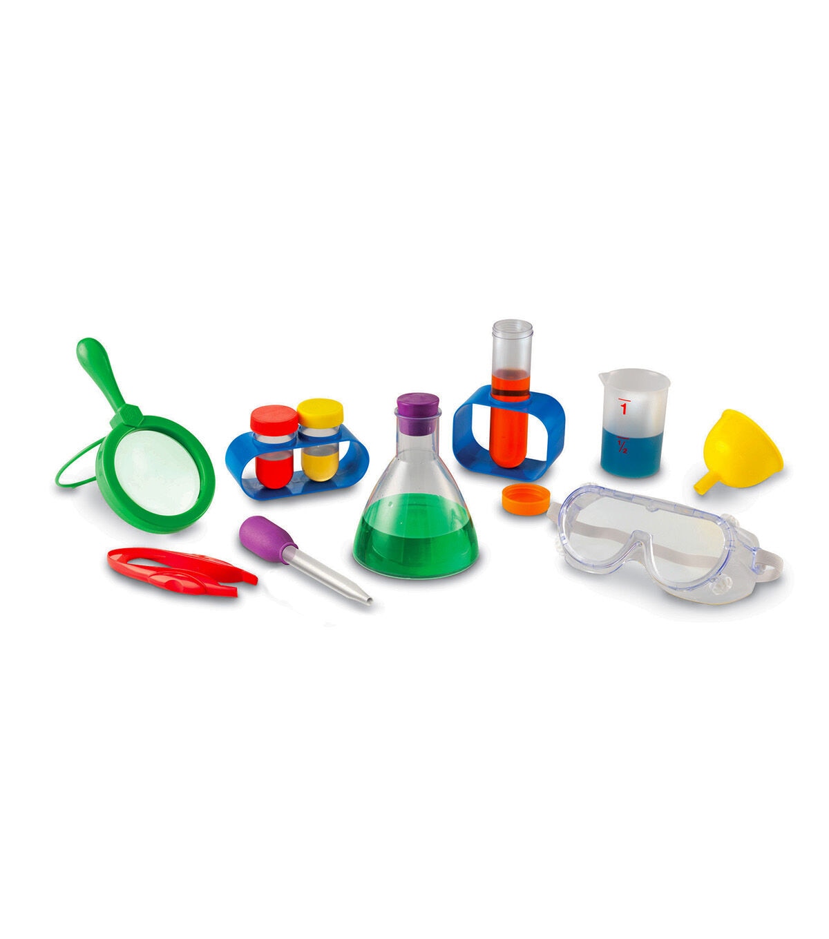- 12-piece set includes: beaker, magnifying glass, funnel, eyedropper, flask, tweezers, goggles, 1 large 6" test tube (with lid and stand), 2 small test tubes (with lids and stands), plus 10 activity cards