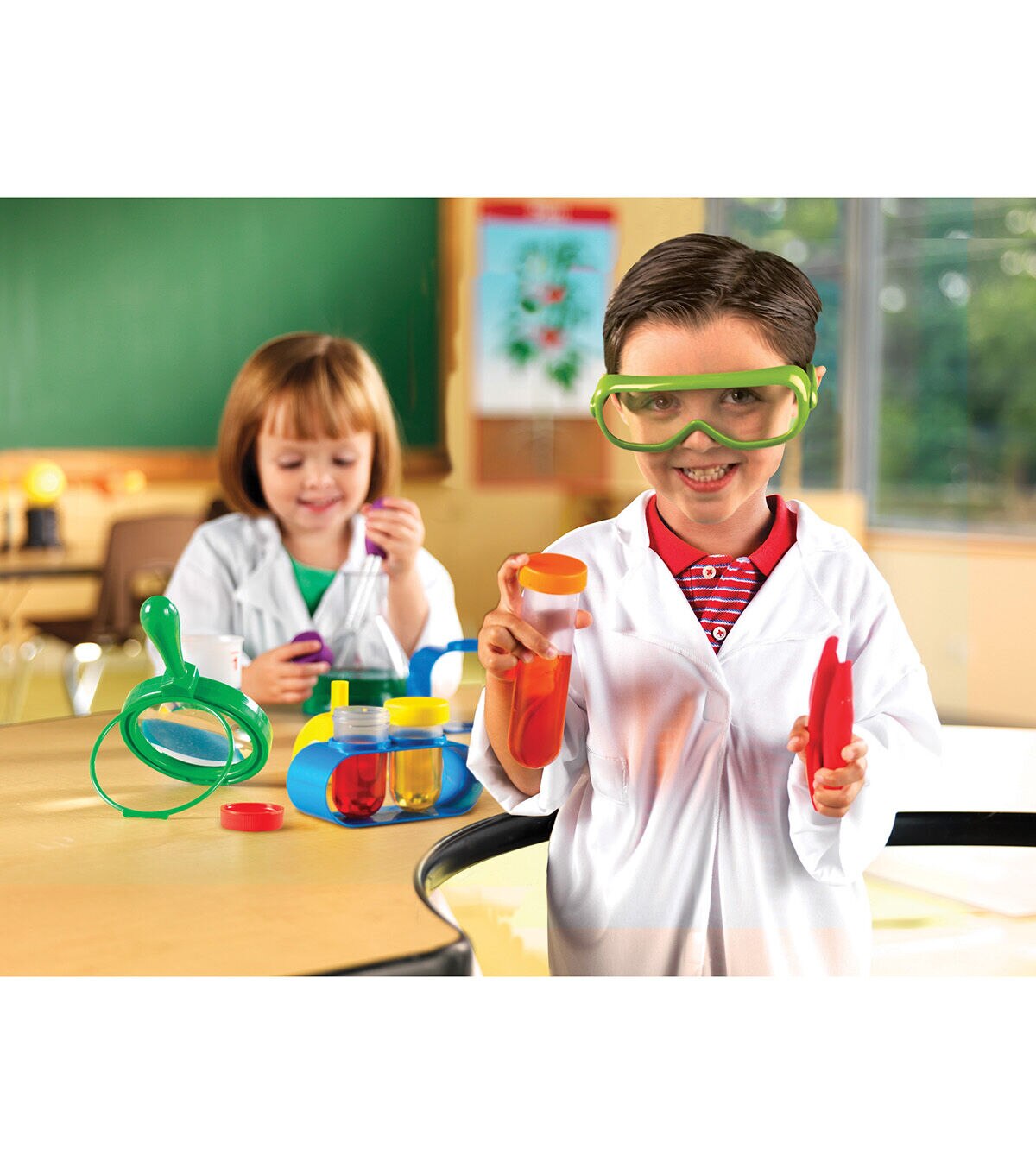 Perfectly sized science tools support early hands-on science investigations. Durable pieces feature measurement markings. Activity cards introduce science process skills, living and nonliving things, physical science, senses and more. Educational Benefits: Learning Style (Visual, Tactile), Skill Development (Math, Fine Motor). Includes: Beaker, Magnifying glass, Funnel, Eyedropper, Flask, Tweezers, Goggles, 1 Large 6” test tube (with lid and stand), 2 Small test tubes (with lids and a stand), 10 activity cards. Age 3+. Grade PreK+.