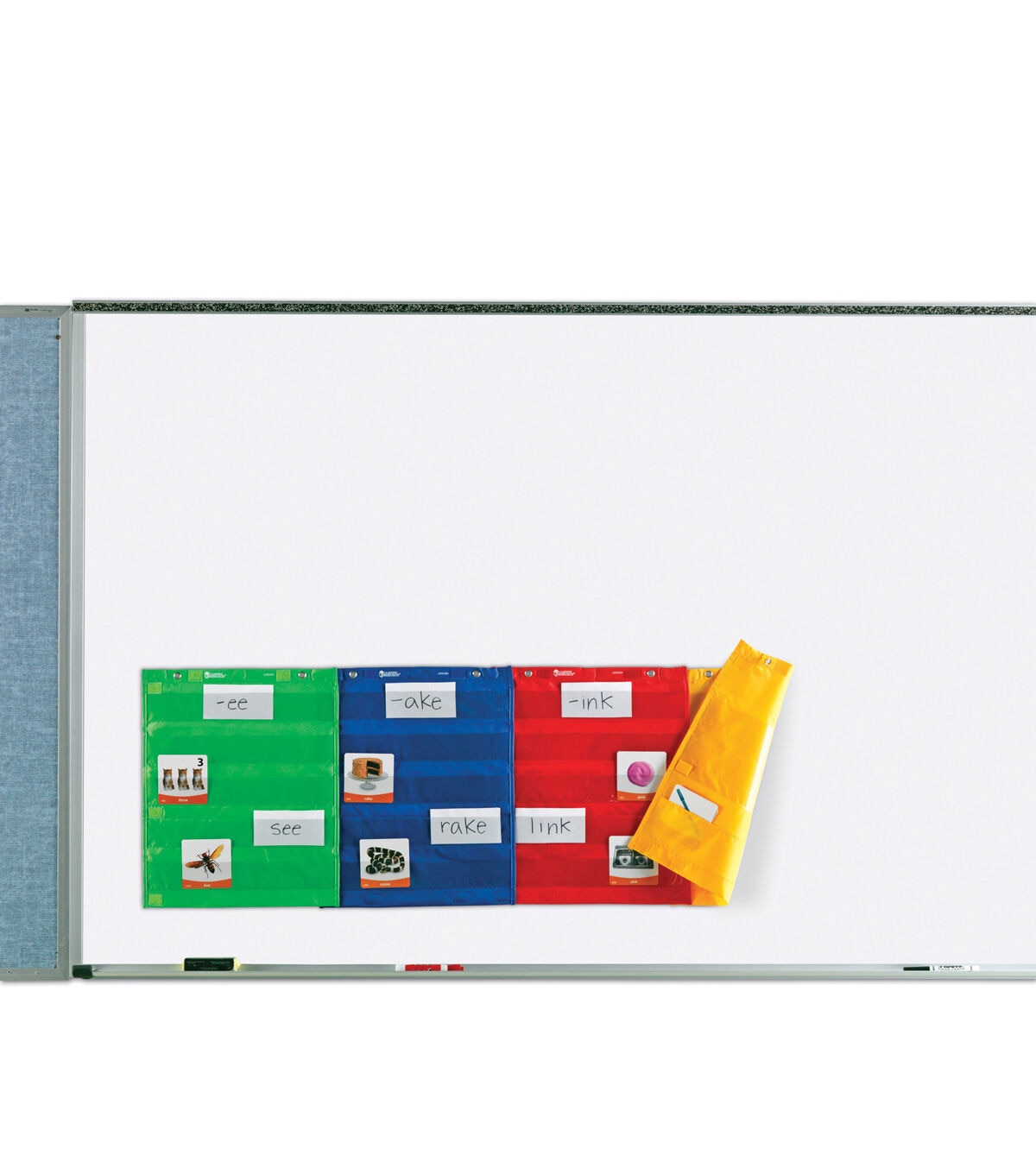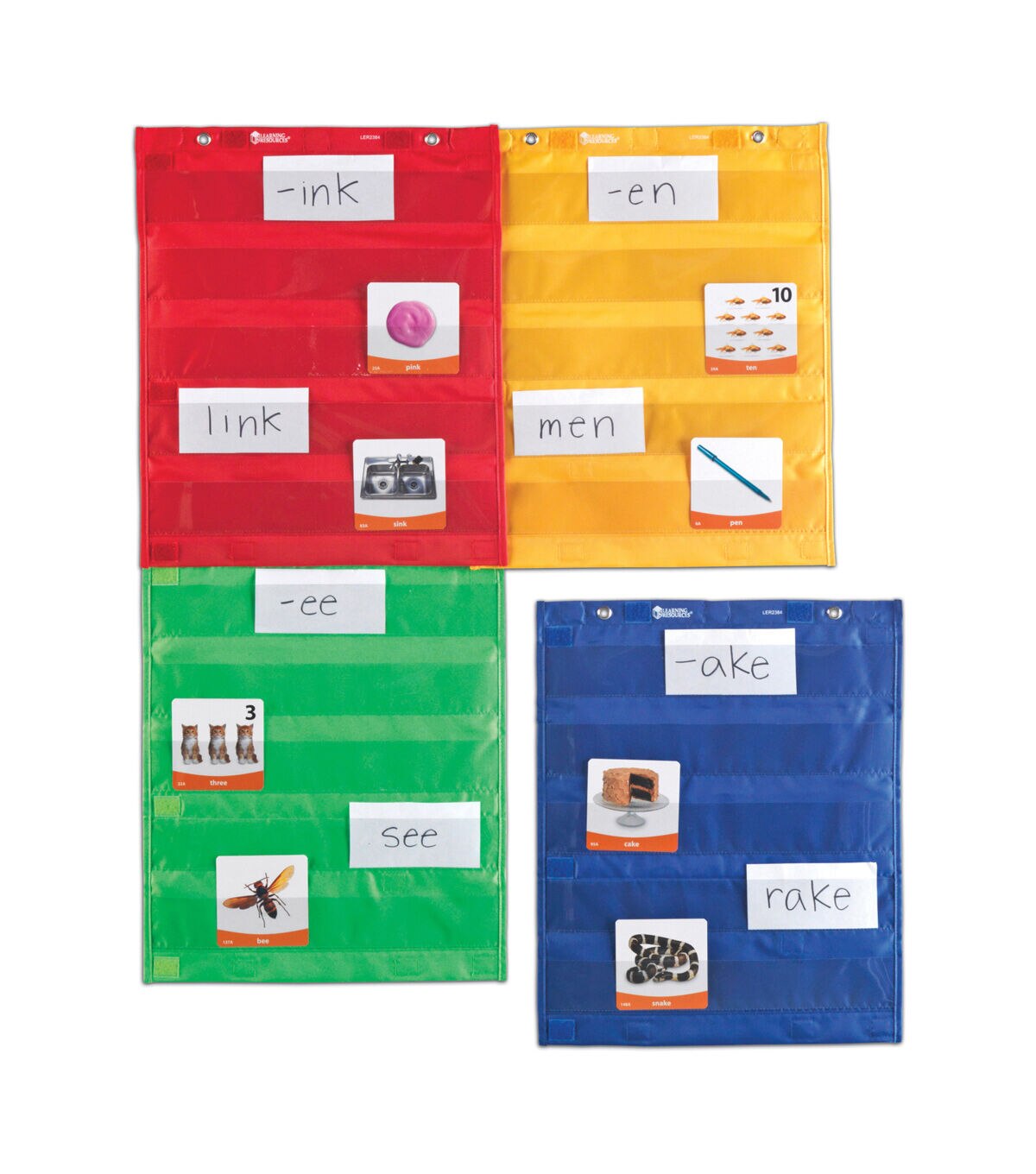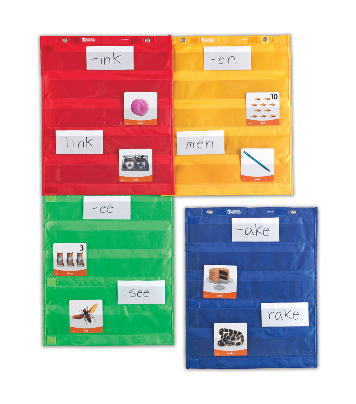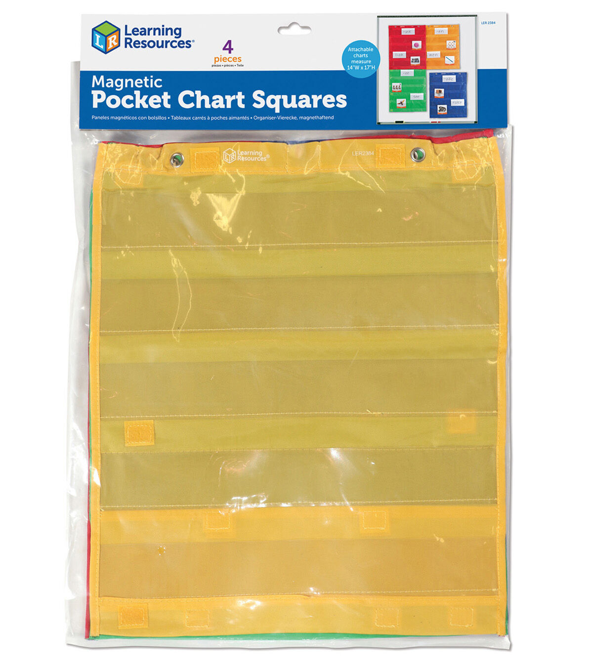 Magnetic Pocket Chart Squares Beyond versatile! Use the 4 charts alone, connect vertically or horizontally with hook-and-loop fasteners to make a larger chart! Great for small groups, centers, combined whole-group displays and more. Features 5 rows of clear pockets for your own cards, plus 2 large storage pockets on the reverse side. Four colors- red, orange, blue, green. Hang with included magnets or grommets. Each chart measures 14"L x 17"H.
