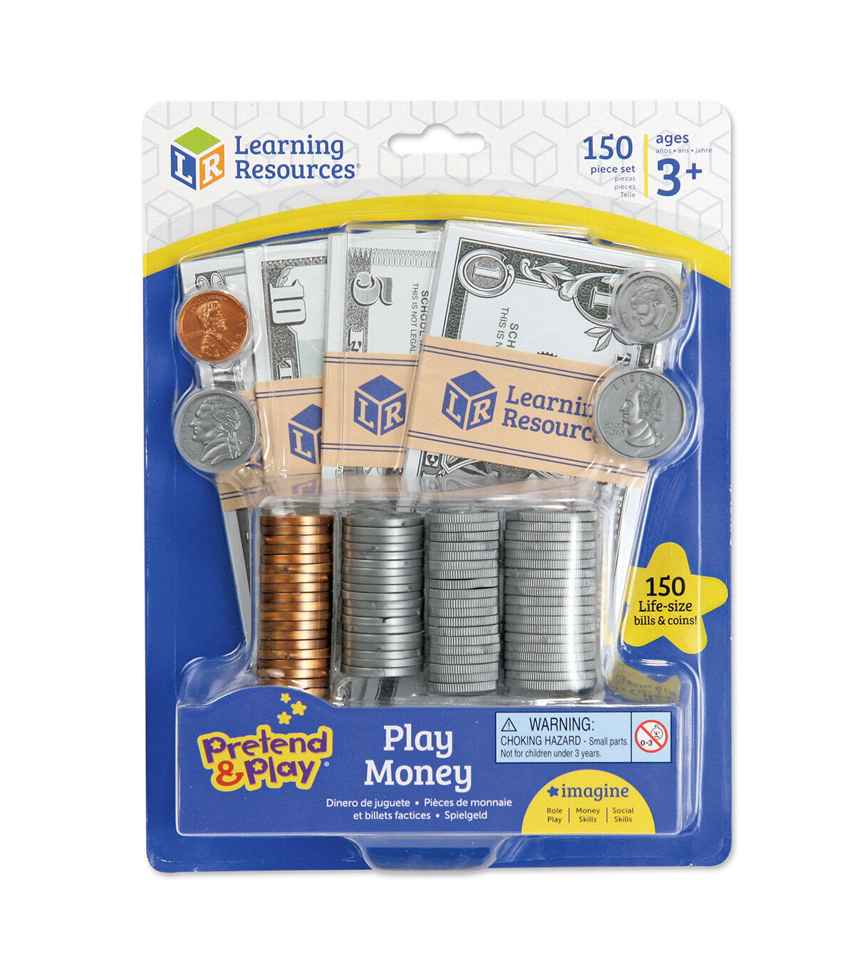 Teach coin and bill recognition, subtraction, addition, and calculation of correct change. Set of 150 includes actual-size bills and authentically detailed coins. Perfect for use with Pretend & Play cash registers and other role play sets!
