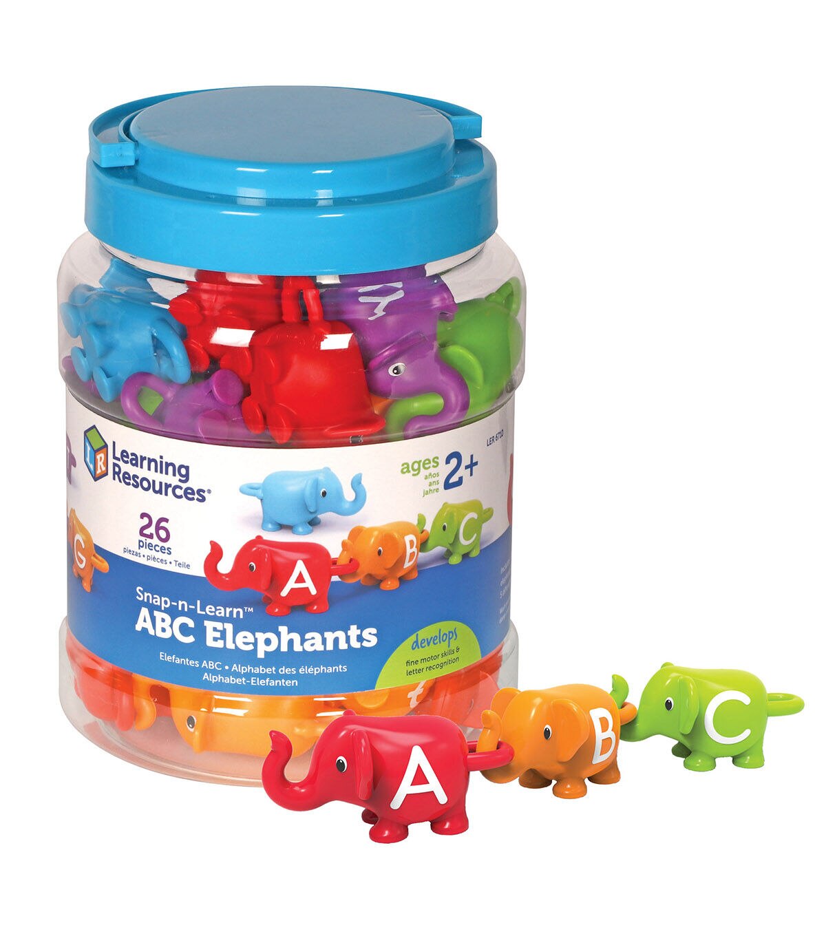 The elephants are on parade, and they're bringing the alphabet with them! Kids learn their ABCs during imaginative animal play sessions with the Snap-n-Learn ABC Elephants from Learning Resources. Printed with every letter of the alphabet, these 26 colorful elephants come with snap-together trunks and tails that make learning language skills easy and fun. Elephants come in five vibrant colors—red, orange, green, blue, and purple—and their easy-to-grab plastic construction makes it simple for little hands to develop fine motor skills during each engaging play session. The Snap-n-Learn ABC Elephants from Learning Resources also grow along with kids' skills; once they've mastered snapping elephants together in alphabetical order, little ones can also snap their elephants together to form simple words and work on basic vocabulary skills. When play time is over, each set of Snap-n-Learn ABC Elephants fits easily within the included tub, making cleanup and storage simple and fast.