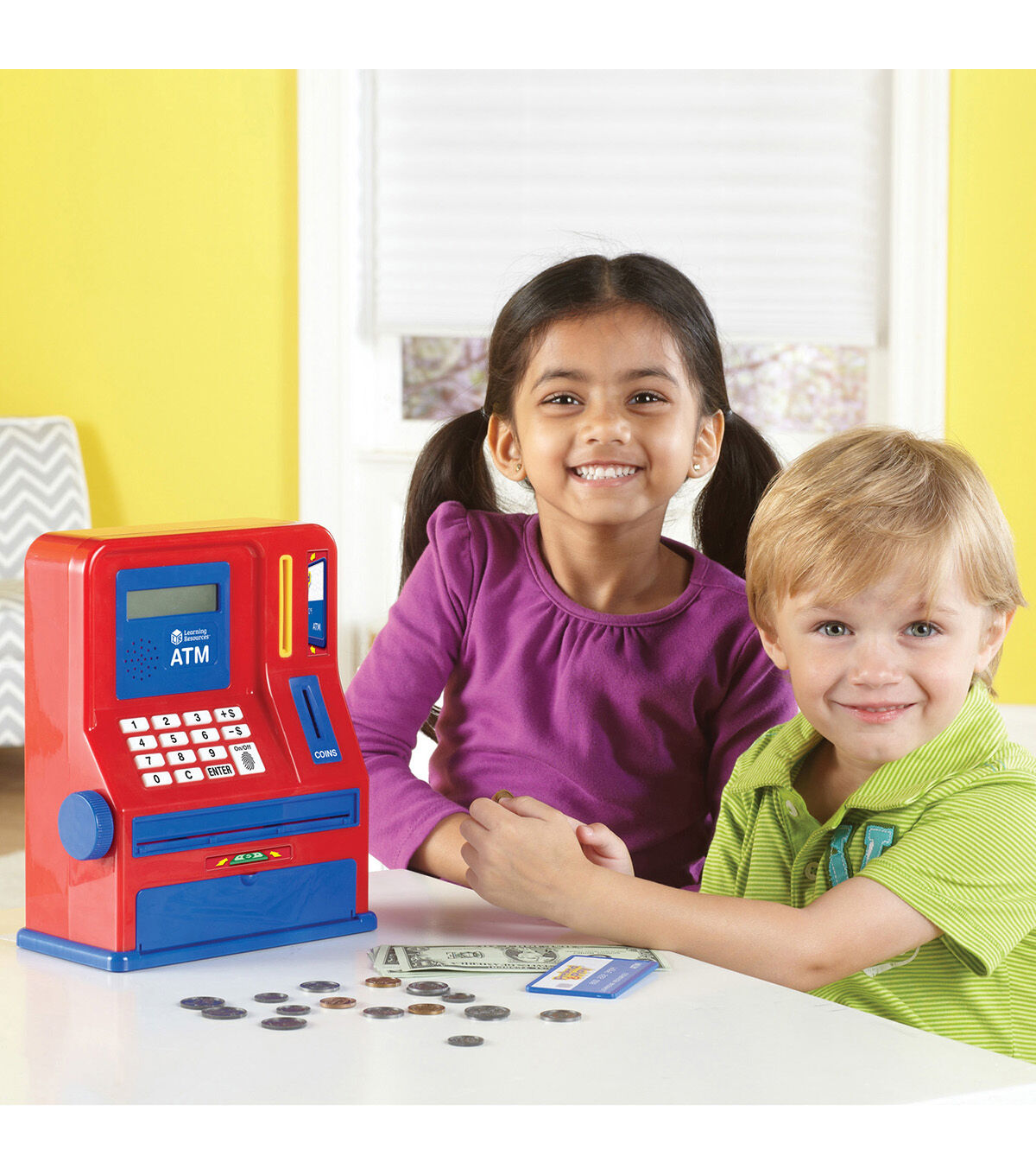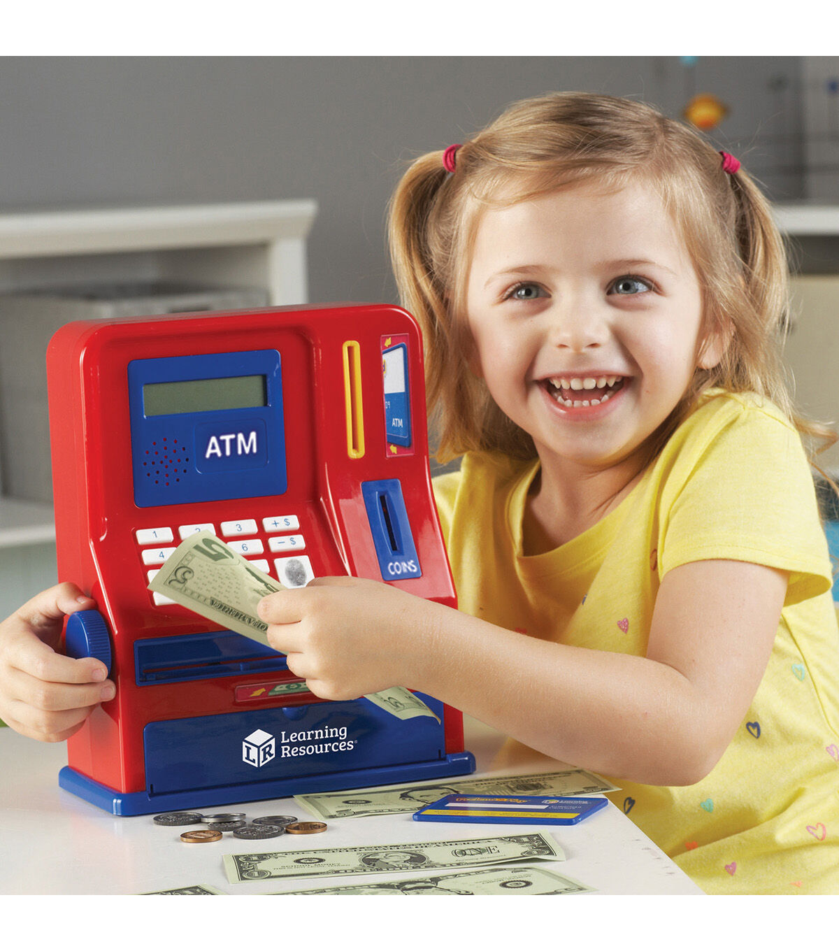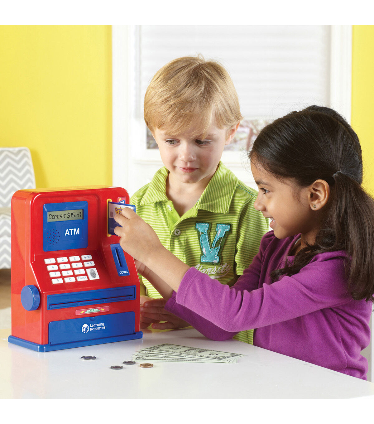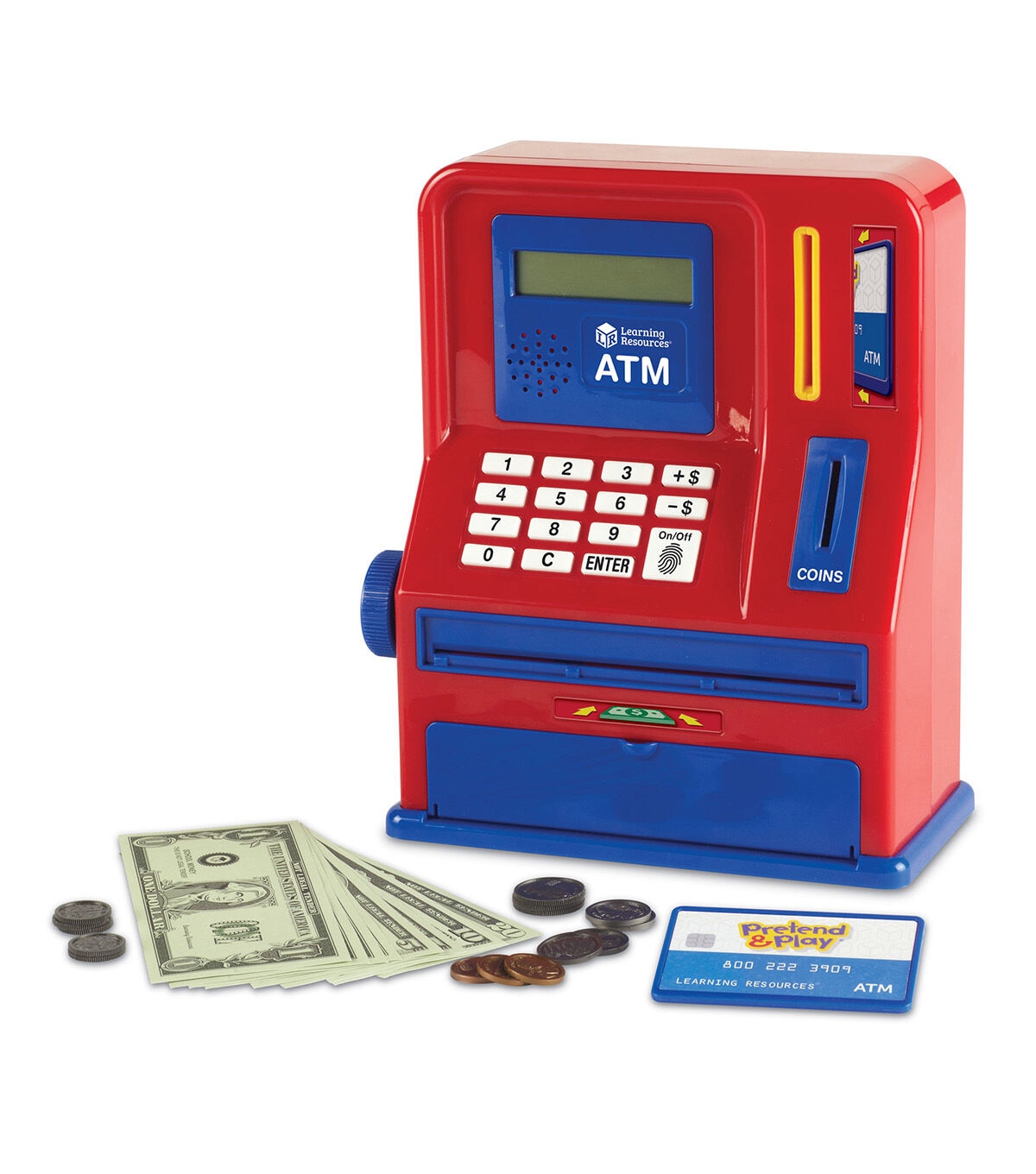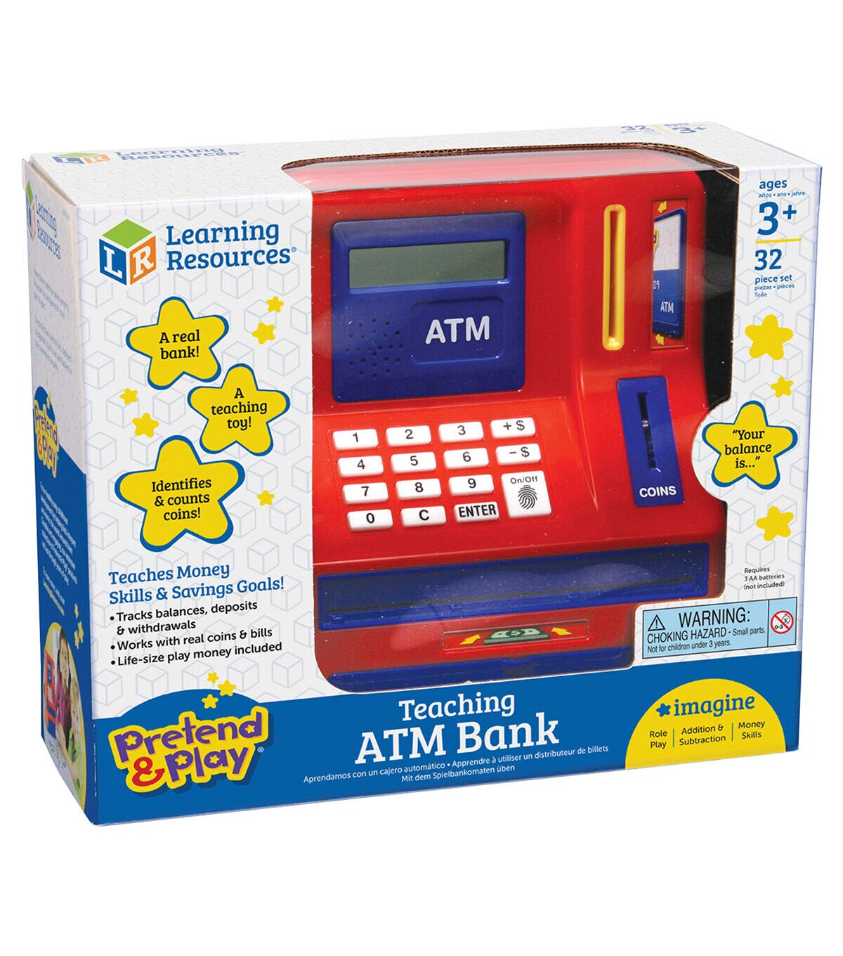 Kids can learn money management early with this electronic teaching ATM. Kids will have hours of fun counting, depositing, withdrawing, and saving with both real and pretend money. Features coin recognition, a mechanical bill feeder, and a pretend thumbprint sensor. Includes play money and ATM card. ATM measures 8”W x 10”H. Ages 3+ years, grade PK+. Requires 3 AA batteries not included.