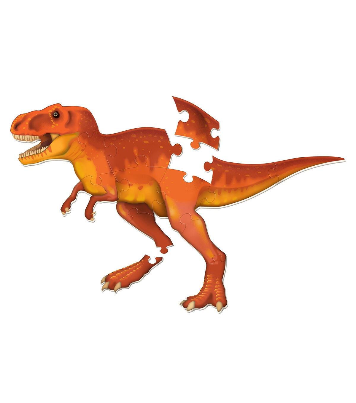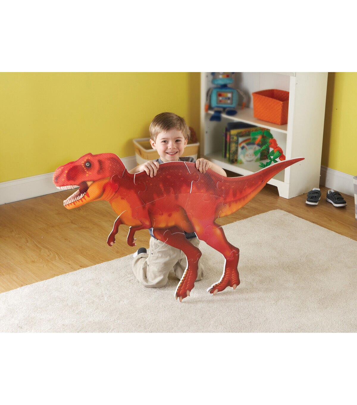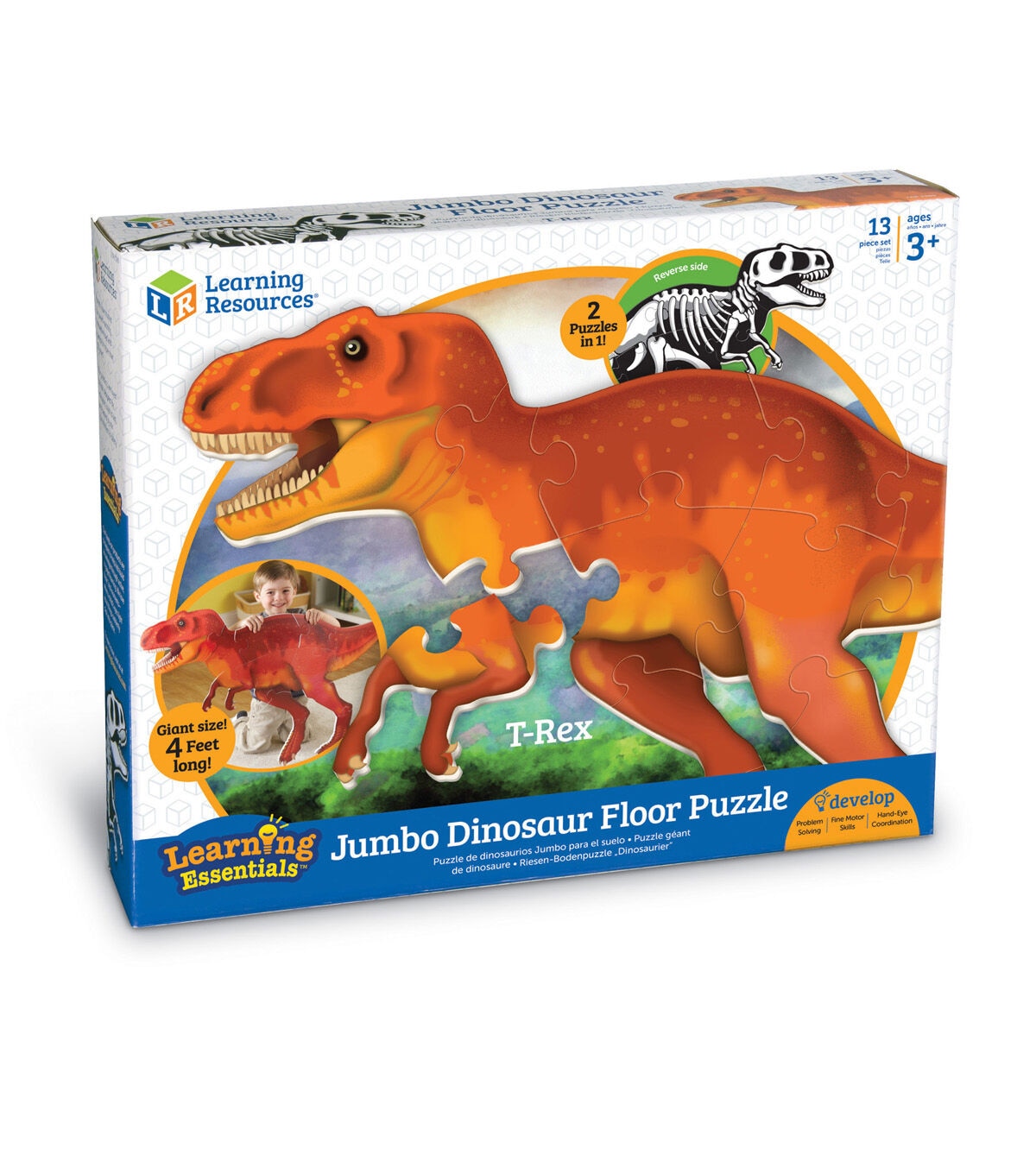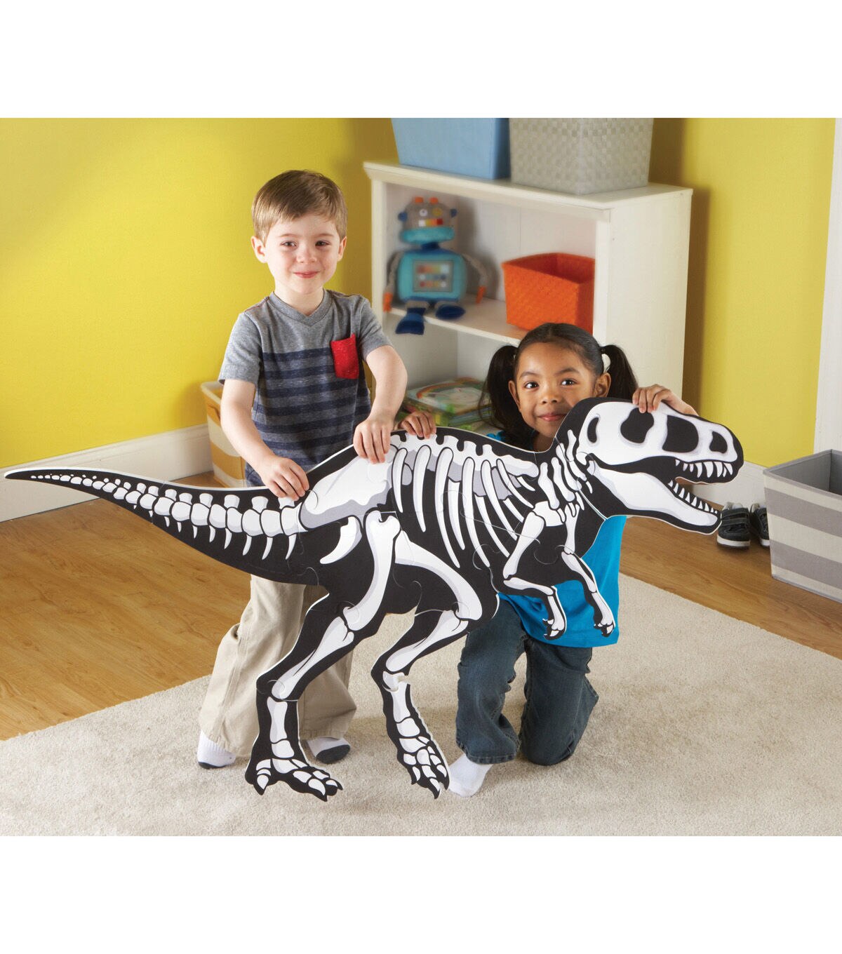 It's a puzzle and a science lesson all in one! Help your little learners develop an early love of science with this gigantic 13-piece puzzle. The big, soft foam pieces are perfect for small hands and safe for home or classroom floors. The big, bright T-Rex is on one side, with his skeleton on the other side, so kids can keep finding new ways to play and learn. Measures 4'L x 2'H when complete.