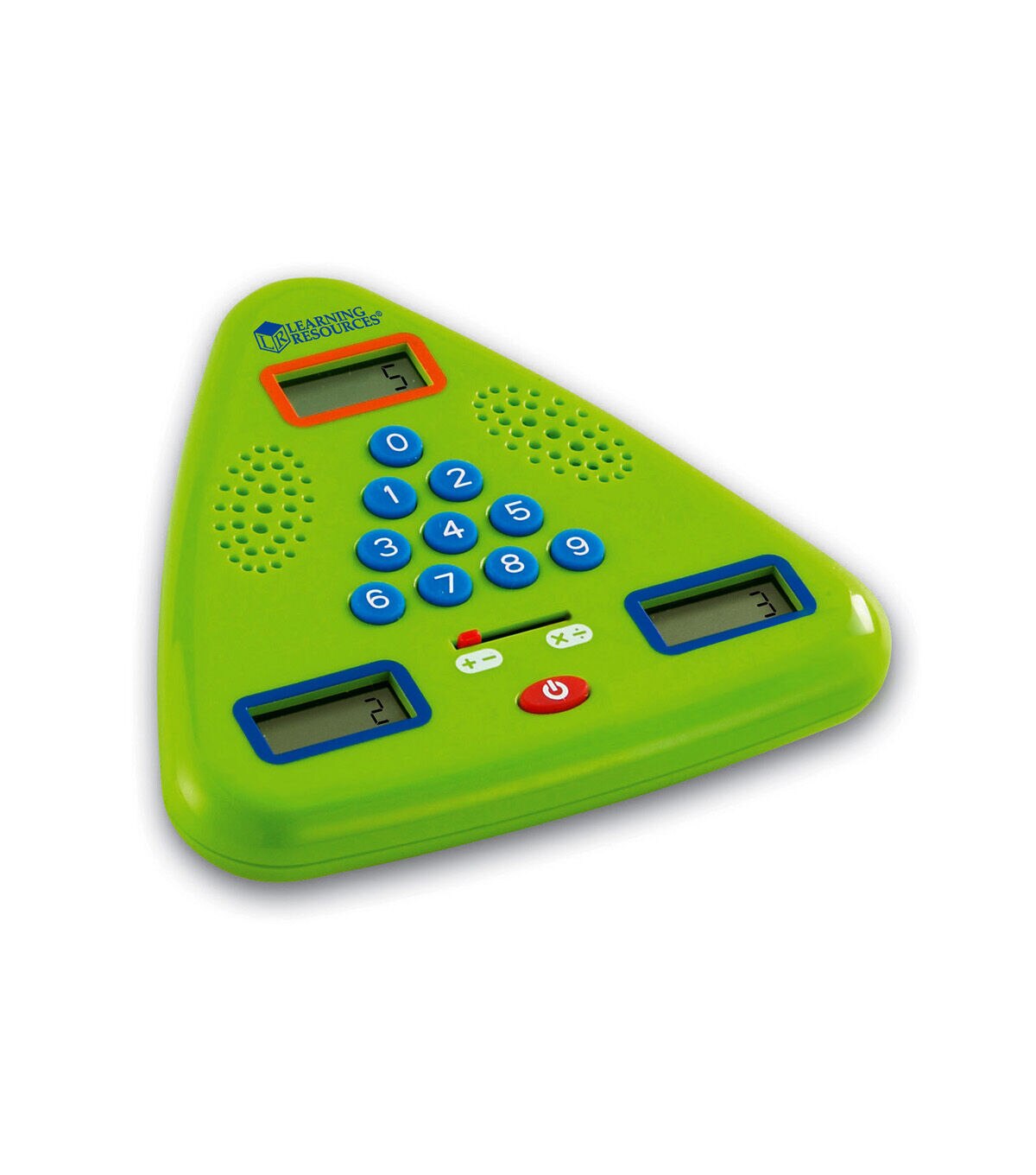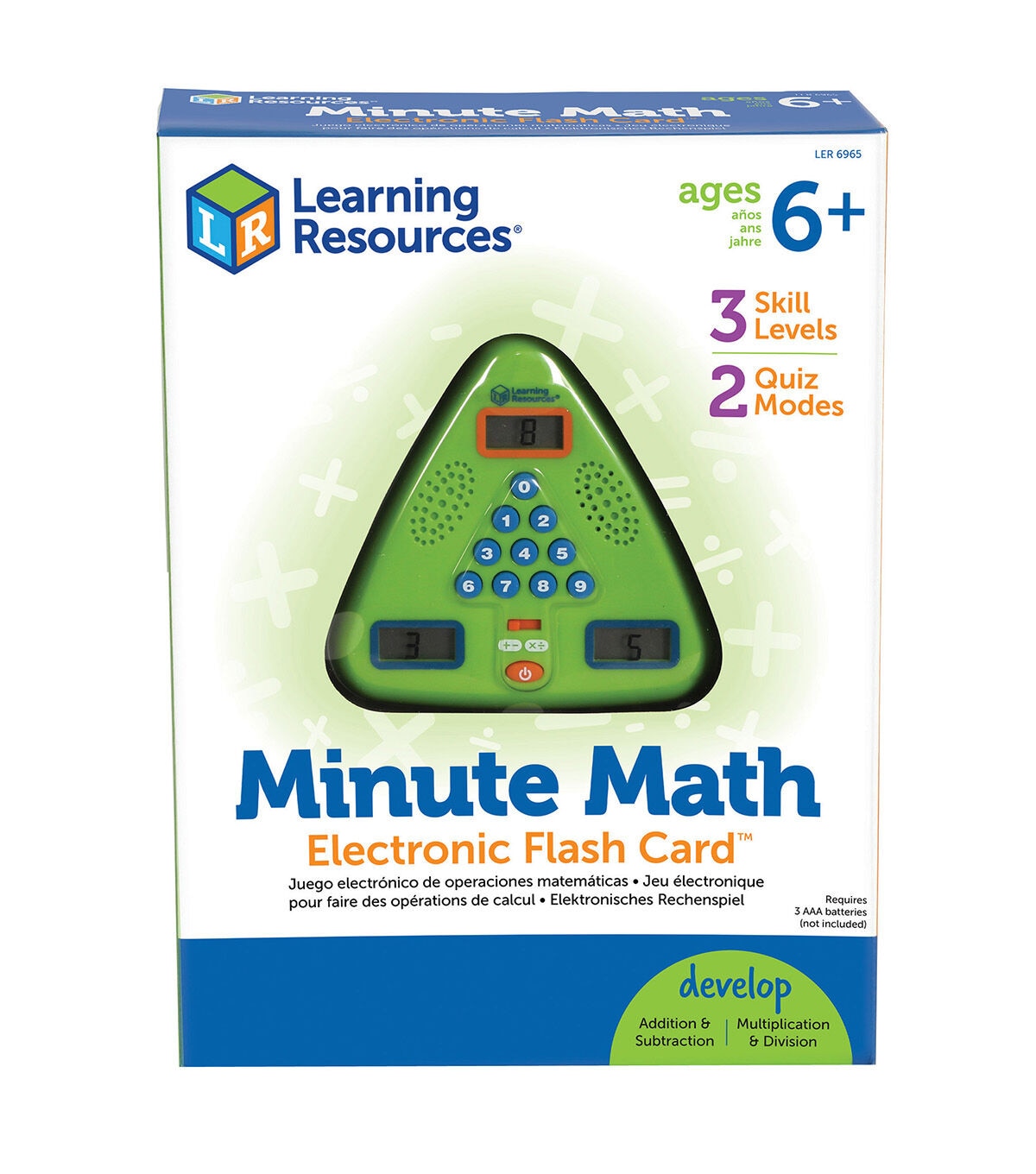 Build number fact fluency in just a minute with the Learning Resources Minute Math Electronic Flash Card. The familiar math fact family triangle is reinterpreted in an engaging electronic format in this kit. It encourages practice of operations like addition and subtraction or multiplication and division, and early algebraic skills related to equations and the commutative property. It features a 60-second timed mode and a low-pressure untimed mode, plus three levels of difficulty. This learning game reinforces arts of the equation through color-coded screen frames. It also provides positive, corrective feedback, both visual and auditory. These cards are great for individual practice, or for students answering together. The durable, triangle-shaped unit comes with volume control, and requires three AAA batteries, not included. Choose an operation and level of difficulty. Watch the screens and then fill in the equation’s missing number. Act fast and tally as many correct answers as you can in 60 seconds.