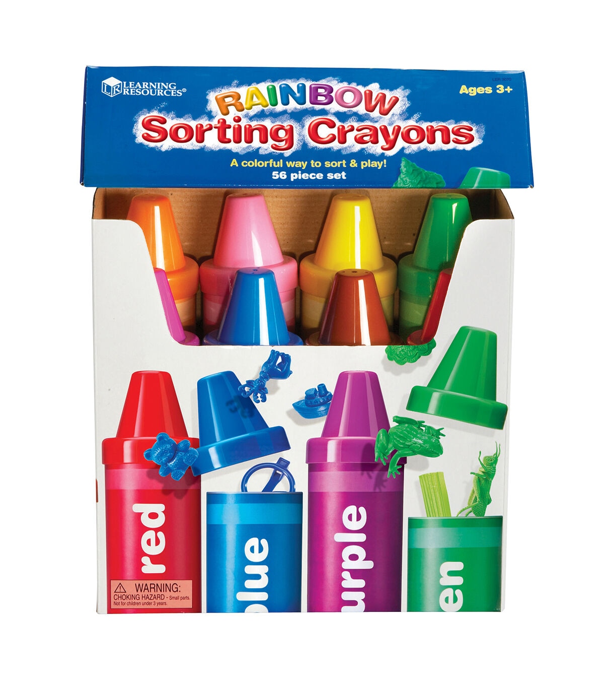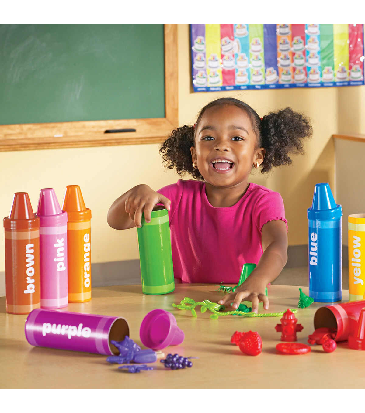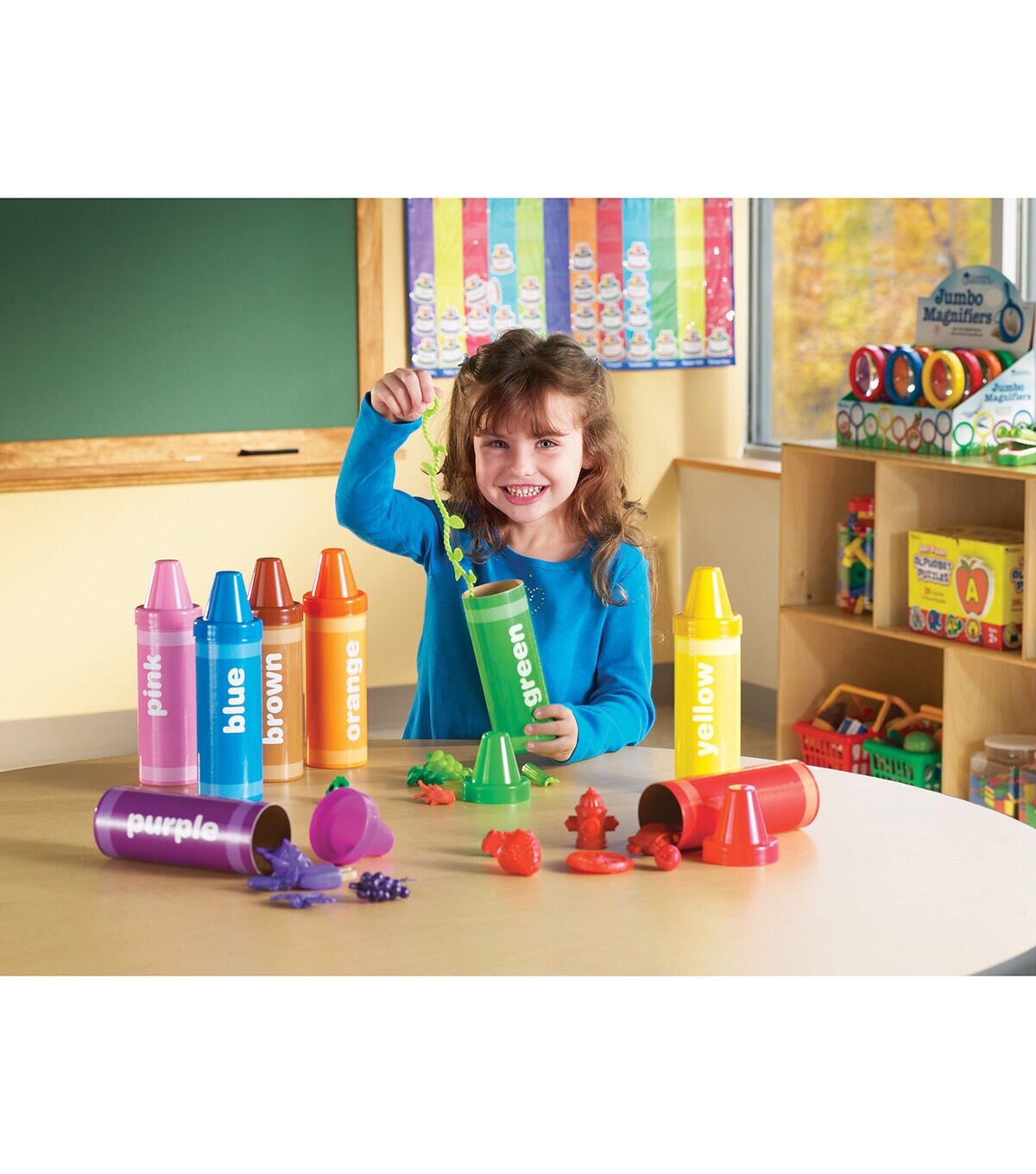 A rainbow of play possibilities comes packed inside these giant crayons. Crayons invite children to peek inside each crayon and discover different color-coded figurines for matching, sorting and imaginative play. Includes: 8 cardboard crayons with plastic lids — brown, red, yellow, green, purple, pink, blue, orange. 48 manipulatives total. Storage box. Each crayon measures 9.5"L x 2.5"D. Grades: PreK+. Common Core State Standards Alignment: Counting & Cardinality, Measurement & Data, Operations & Algebraic Thinking. Learning Style: Visual, Tactile. Skill Development: Basic Concepts — Help students to identify the names of colors and objects, learning about quantities, creating sequences, and understanding spatial relationships such as next to, behind, and in front of. Math - An ideal way to introduce sorting and grouping. Add more fun by counting as each piece is dropped into a crayon tube or create patterns with the objects to introduce AB patterning. Organization — Forty-eight objects separated into 8 colored crayon tubes introduce early organizational skills. Clean up becomes part of the activity by putting all of the objects into their respective crayons.