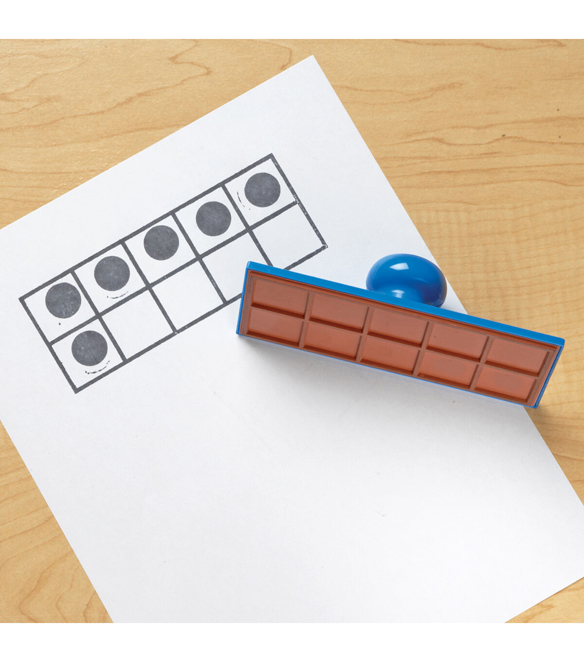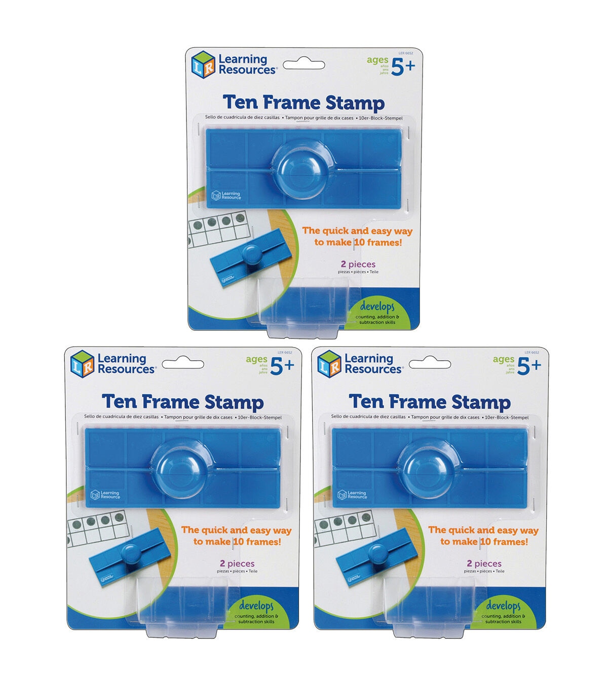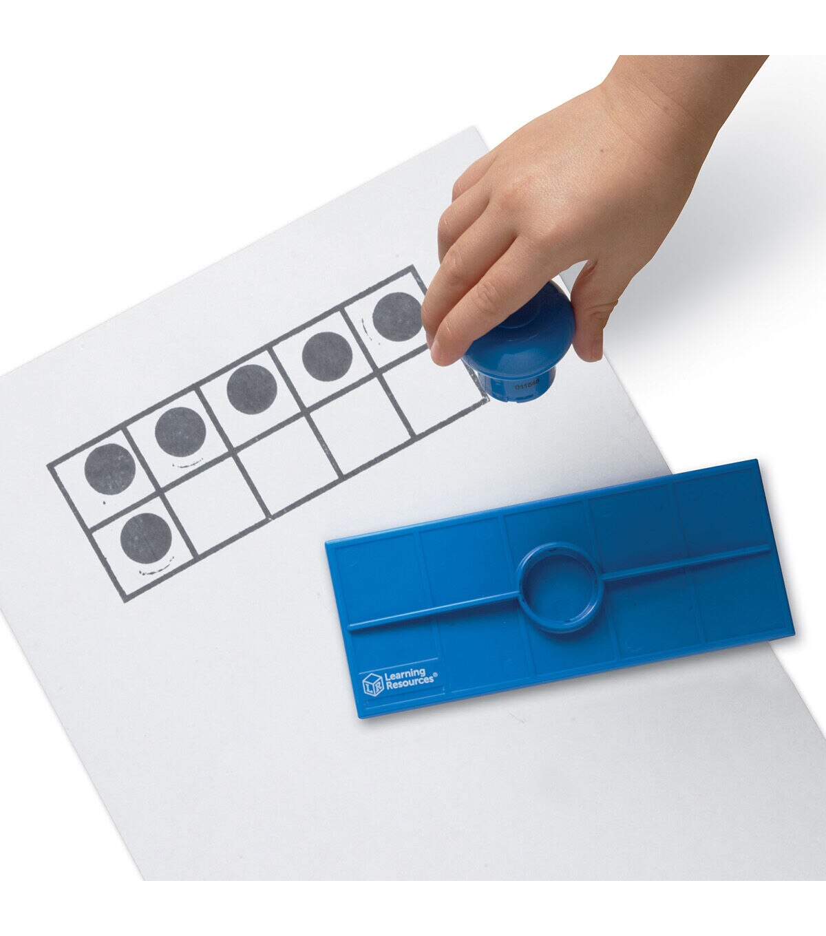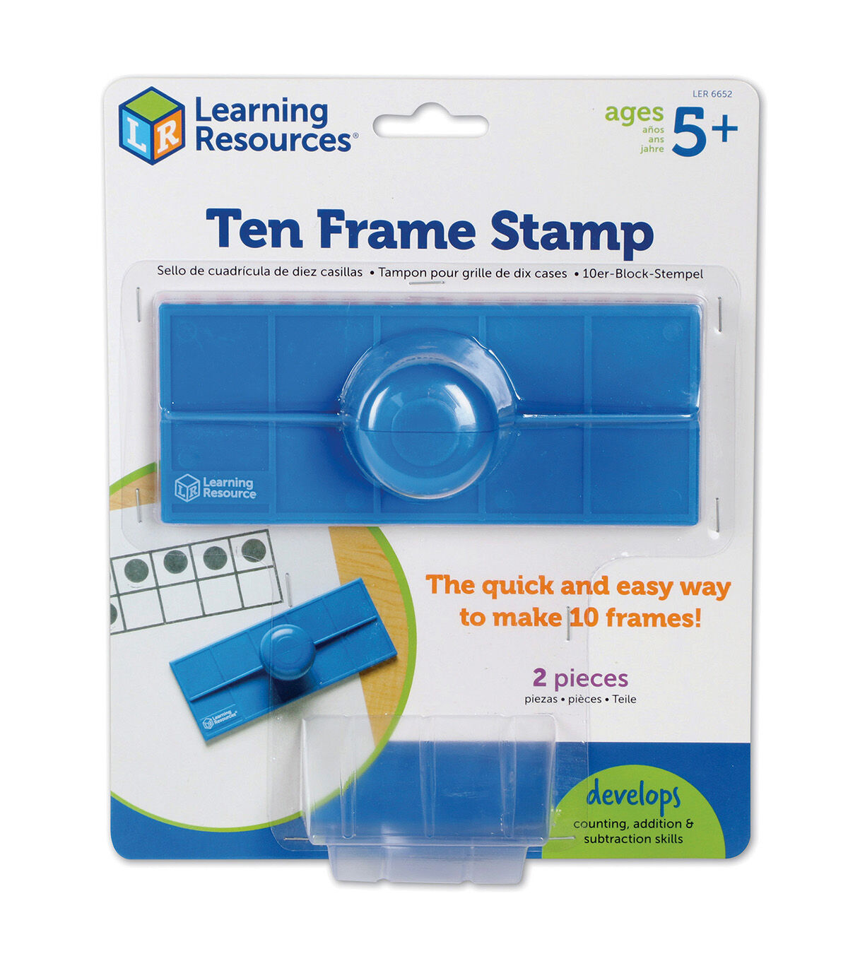 This Ten-Frame Stamp from Learning Resources brings an essential visual element to math lessons that helps kids grasp fundamental concepts in an easy-to-understand way. Favored by teachers in classrooms throughout the country, the ten-frame helps kids build an understanding of each number's relationship to one another and the number 10. With this framework in place, kids can easily grasp lessons in everything from counting and 1-to-1 correspondence to base 10 and number patterns. The Ten-Frame Stamp from Learning Resources adds an extra layer of convenience, letting you replicate the frame as much as you want with the help of just a pad of ink (not included). After stamping out a few frames of your own, you can continue the lesson with the stamp's removable handle, which detaches to reveal a counter stamp sized perfectly for the frames' individual panes. Sold as a set of 3 ten-frame stamps.