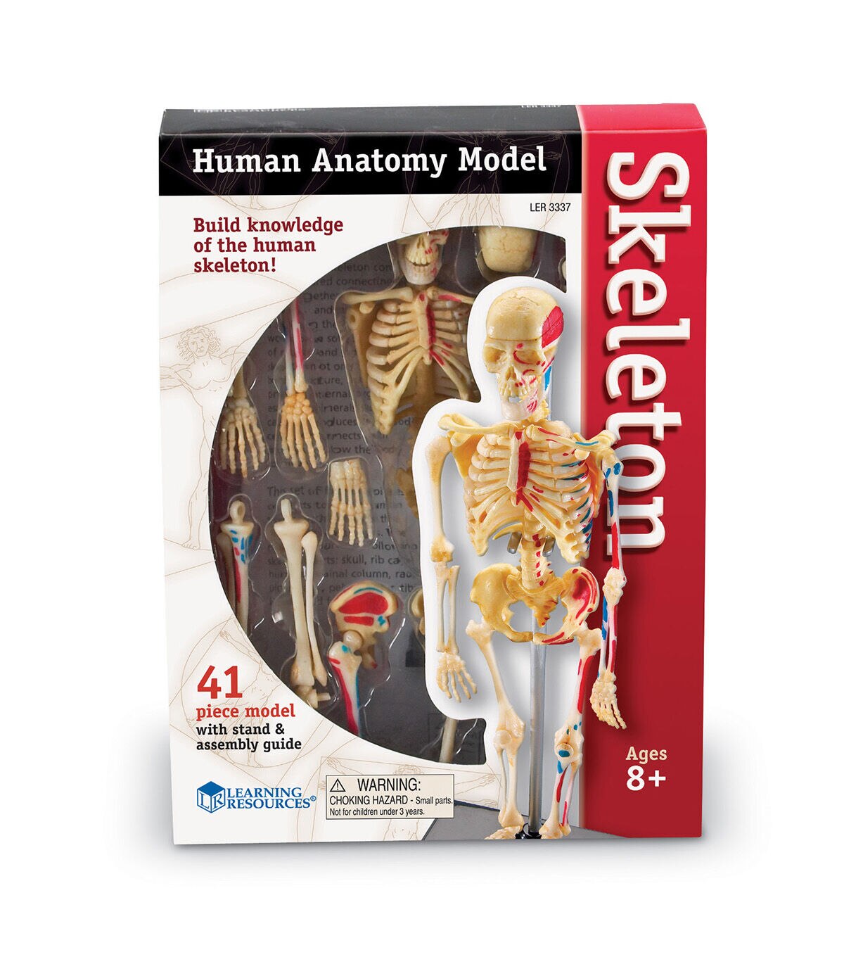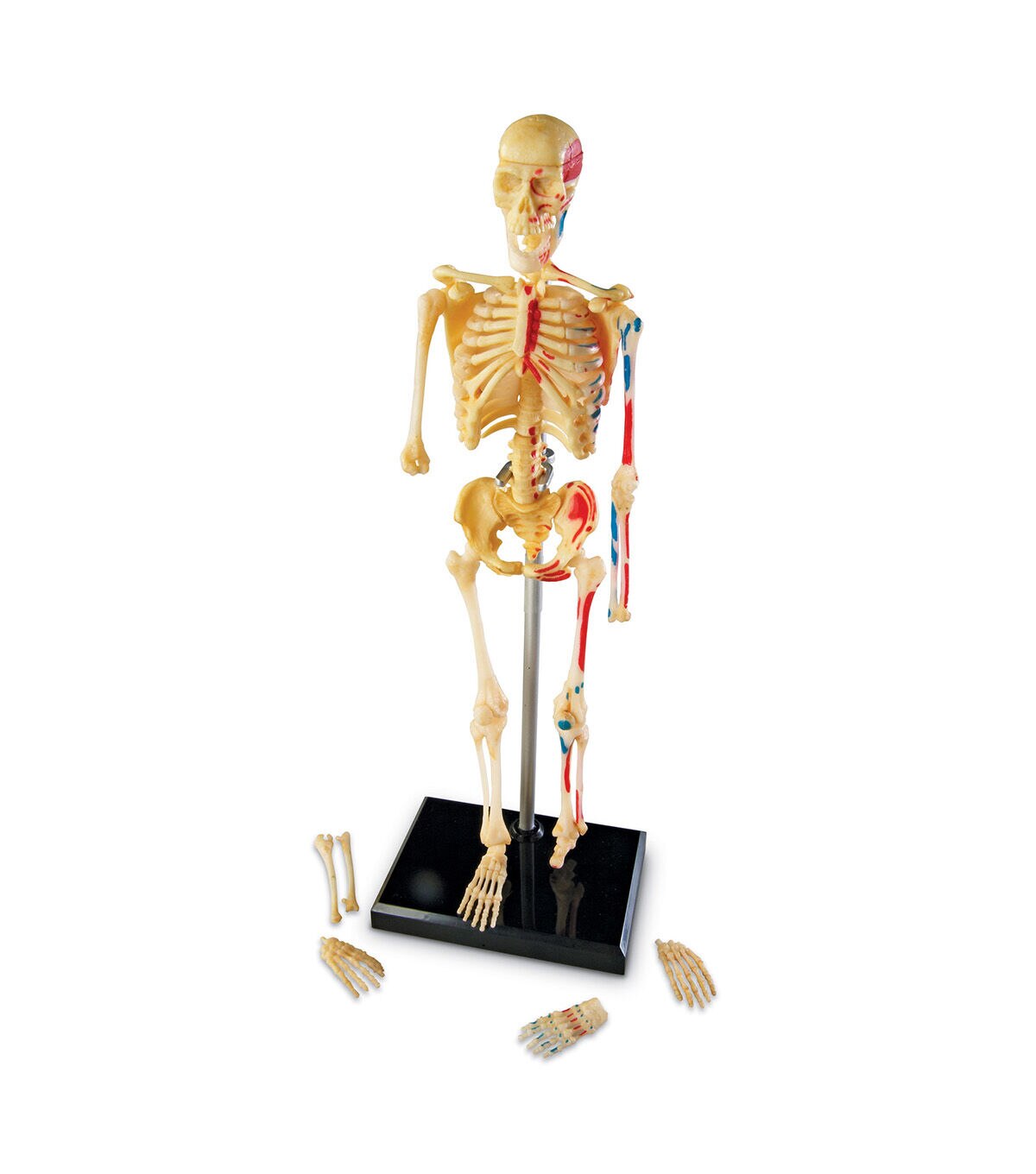 Construct a realistic-looking human skeleton from head to toe, exploring how the bones support the body, relate to the circulatory system and protect organ systems. • Photo-illustrated instructions make assembly easy • Perfect for demonstration or centers • Features skull, rib cage, humerus, spinal column, radius, ulna, hand, pelvis, femur, tibia, fibula, foot and partial circulatory system • Includes 41-Piece plastic model, display stand and guide with skeleton facts • Skeleton stands 9.2"H when complete • Grades 3+