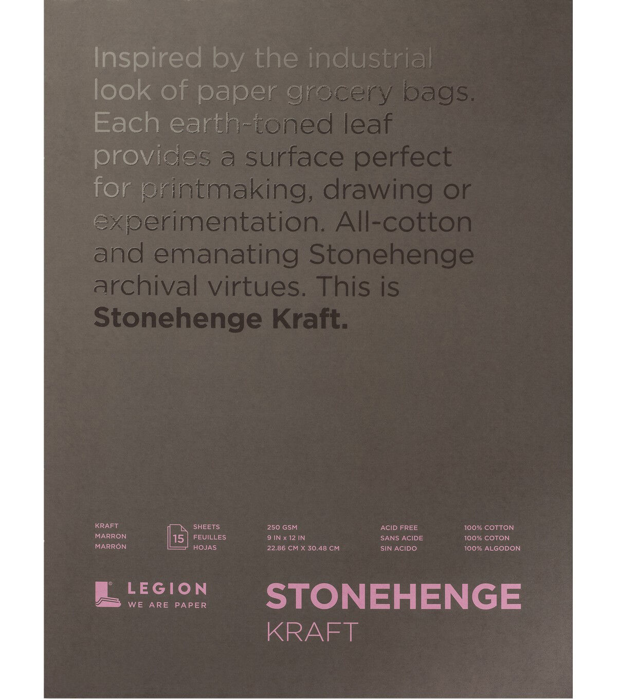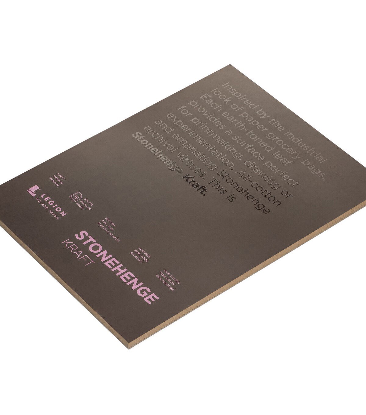 The Legion Paper Stonehenge Paper Pad-Kraft is inspired by the industrial look of paper grocery bags. Each earth-toned leaf provides a surface perfect for printmaking, drawing or experimentation. The sheets are all-cotton and emanate Stonehenge archival virtues. They are suitable for charcoal, colored pencil, graphite pencil, pastels, pen and ink. These fifteen 250-gsm, 100% cotton, acid-free sheets measure 9 x 12 inches.