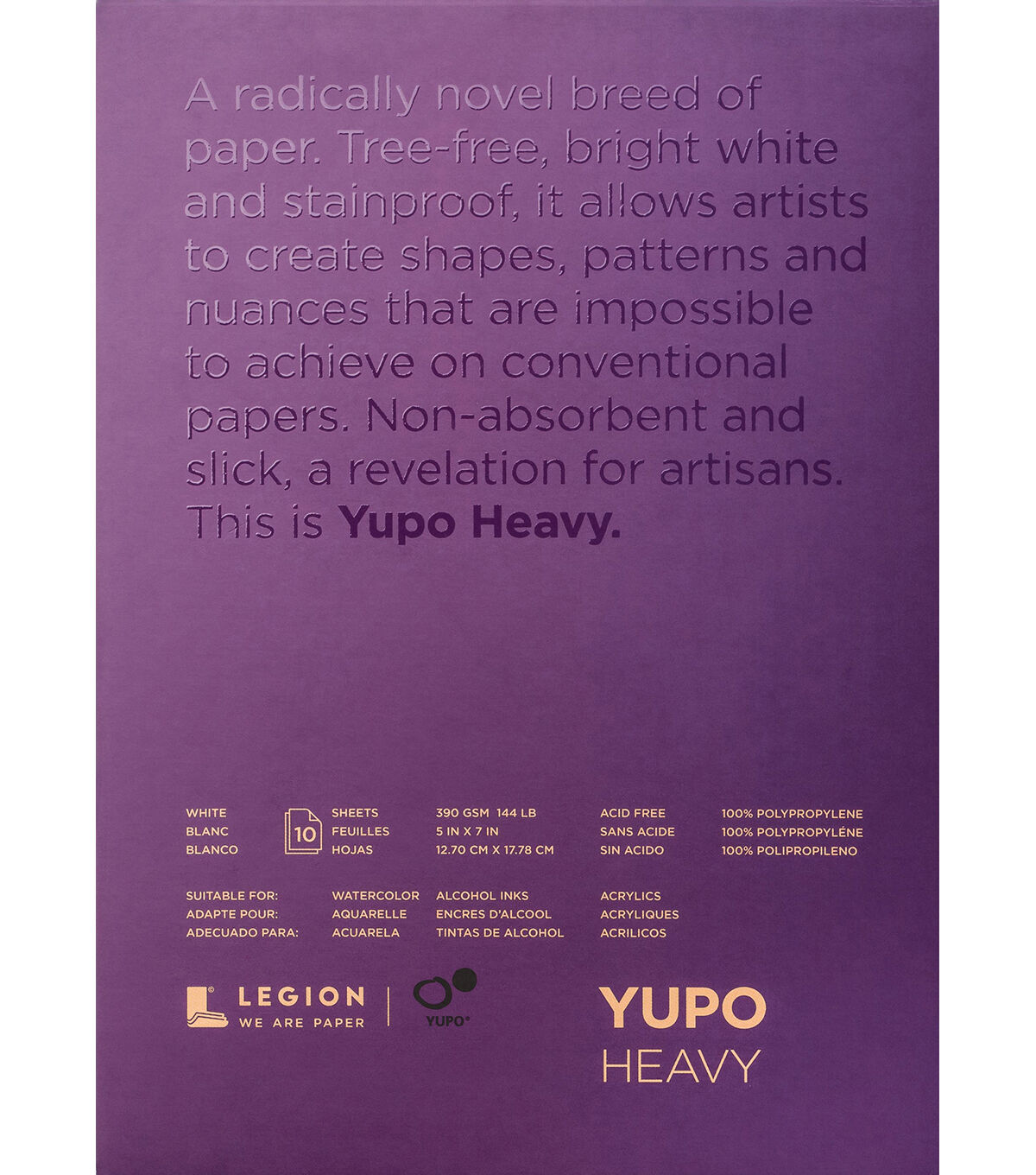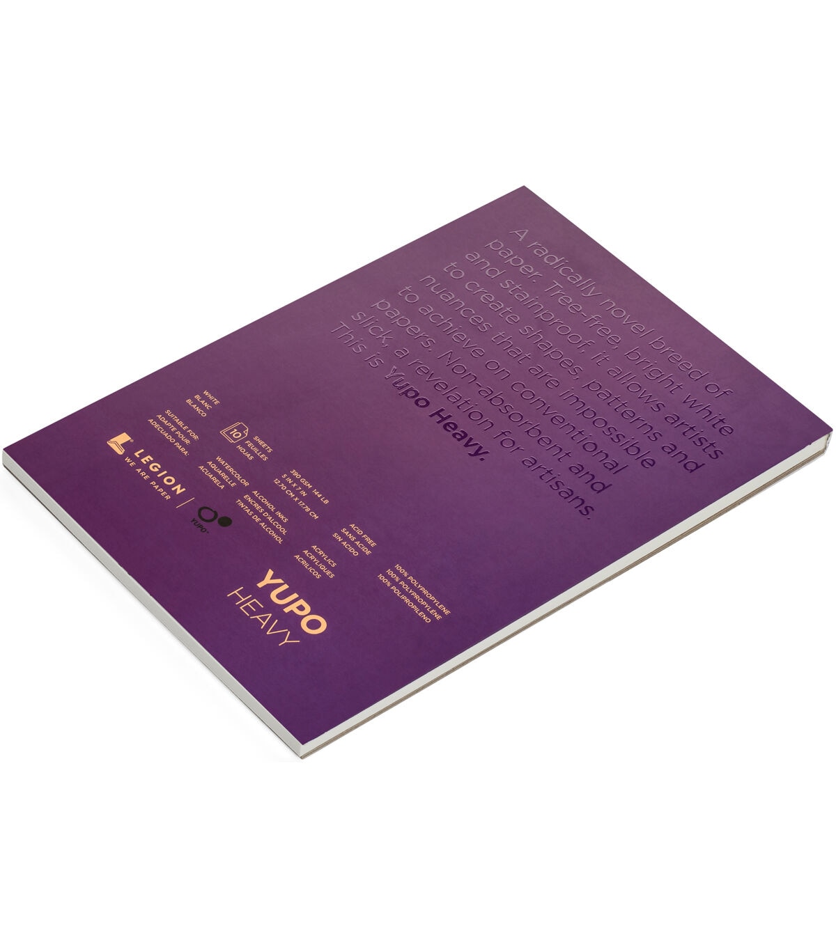 The Legion Paper Yupo Heavy Pad-White is a great choice for artists. Its paper is a unique alternative to traditional watercolor papers. It is an incredibly durable, stain-resistant, non-absorbent synthetic paper that holds ink and watercolor with razor sharp precision. The extraordinary surface also resists tearing and buckling and it remains perfectly flat. This pack contains ten 5 x 7-inch acid-free sheets.