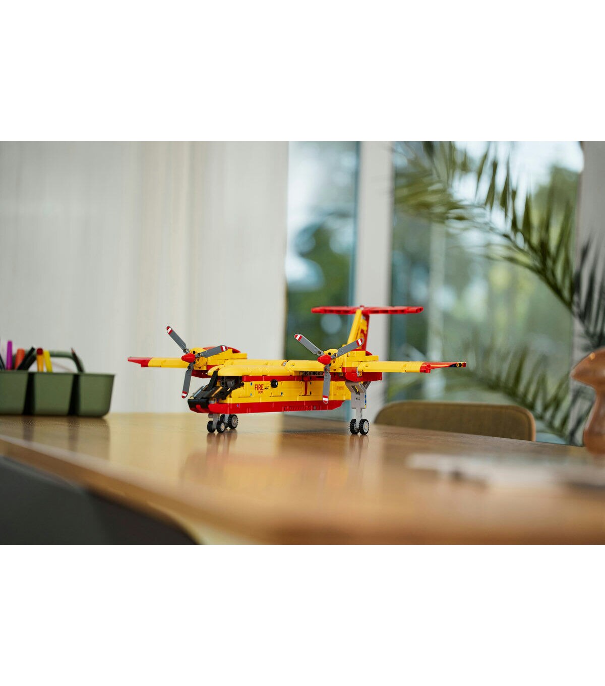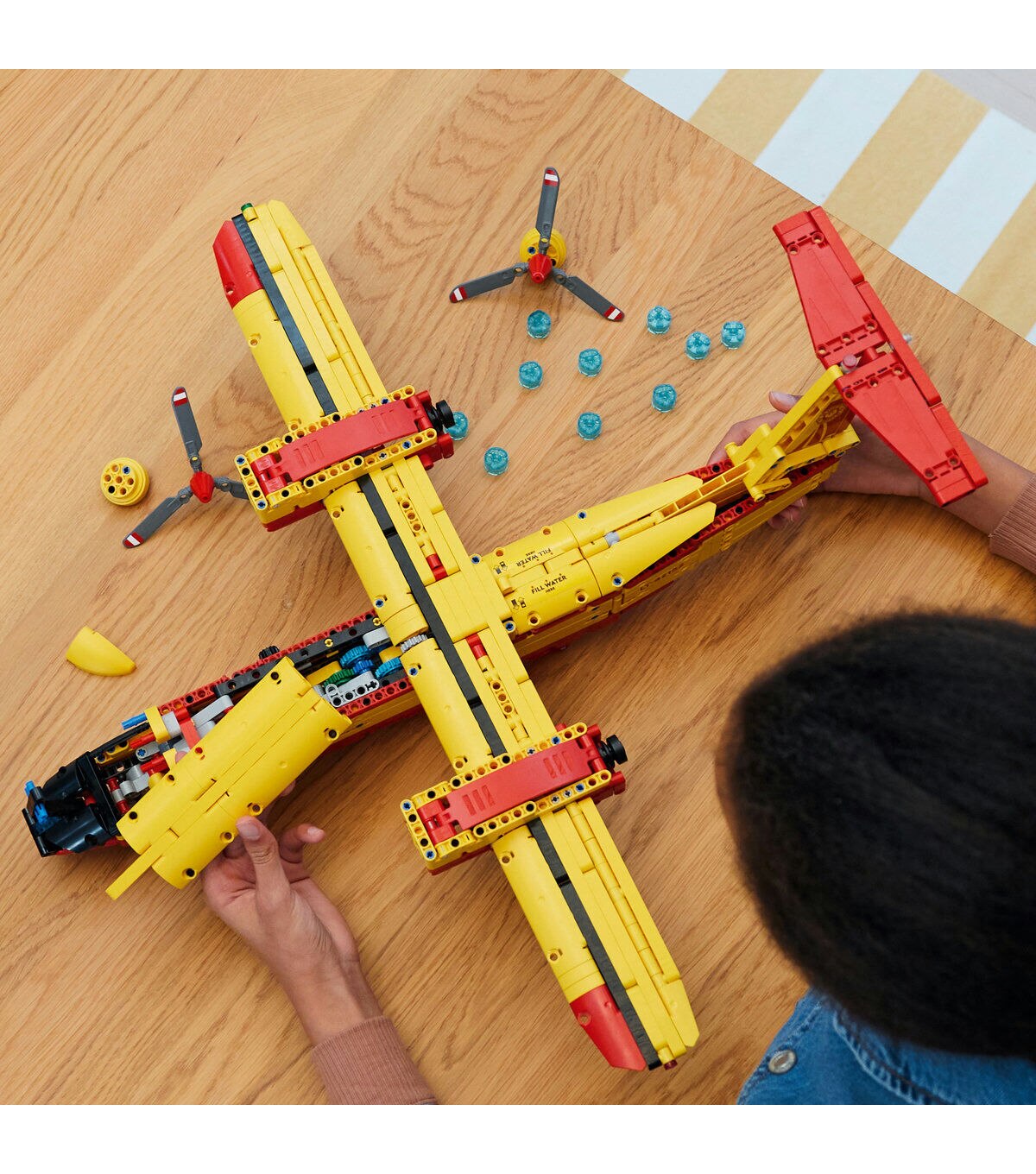 Discover how a real firefighting airplane works with this LEGO® Technic Firefighter Aircraft. Raise and lower the landing gear. Make the propellors spin. Open the hatch to release the LEGO ‘water’ elements. See the tail flap move up and down. With its classic red-and-yellow color scheme, this model is inspired by real aircraft and looks great on display until your next fire rescue mission.