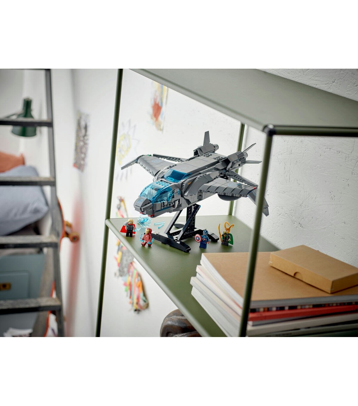 - Authentic recreation of the Avengers Quinjet, with a fold-down undercarriage, adjustable wings and 5 iconic LEGO® Marvel minifigures.