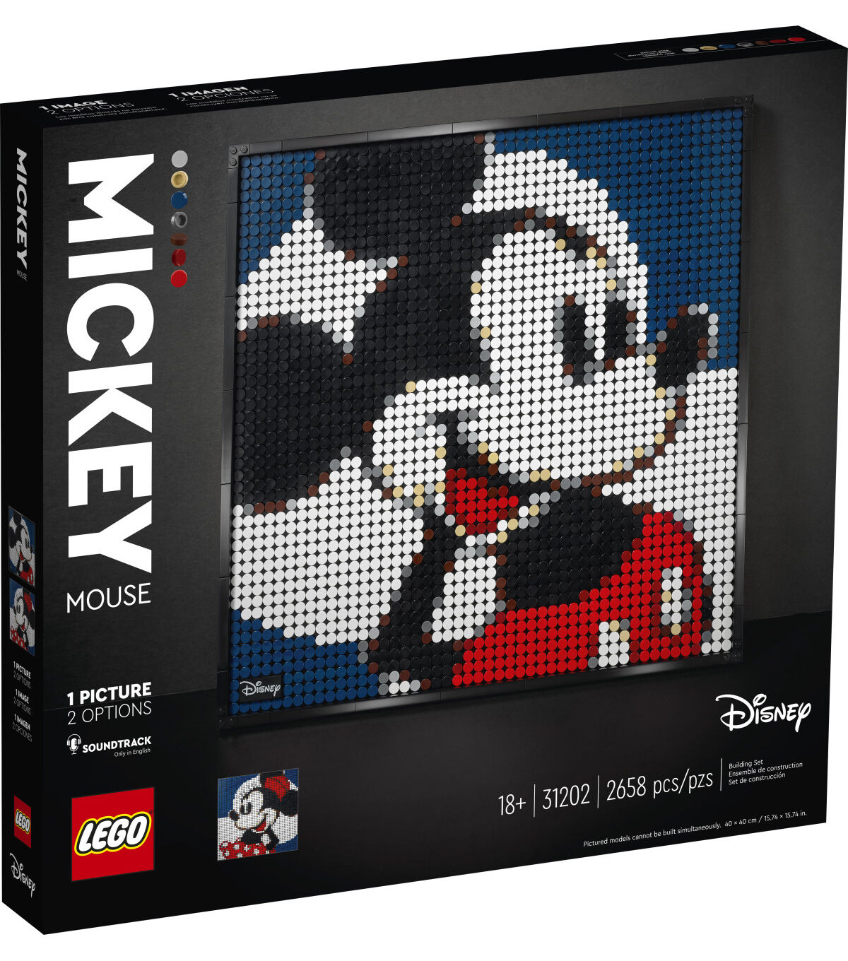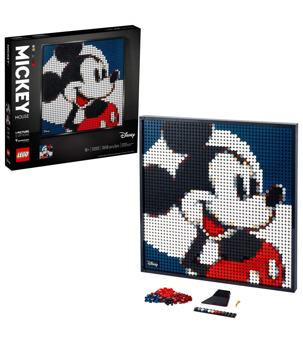 - Show off your love of Disney’s Mickey Mouse or Minnie Mouse with this stunning mosaic LEGO Art Disney’s Mickey Mouse (31202) set. You can display the piece on your wall or shelf after creating it