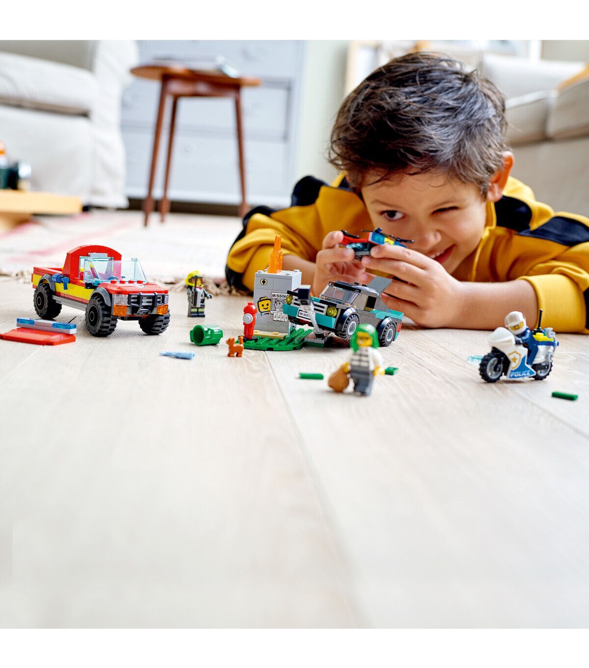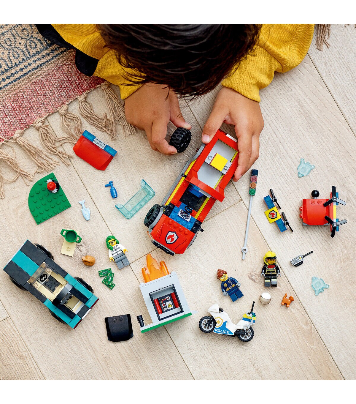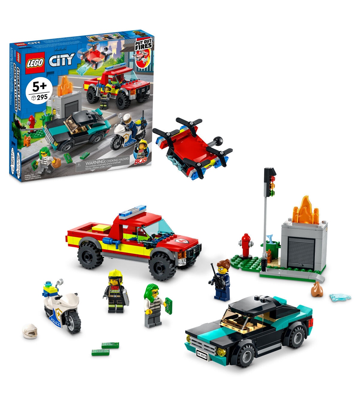 - Features and functions – Kids can shoot LEGO water splat elements from the drone, activate the toppling traffic light and raise and lower the LEGO flames at the fire scene