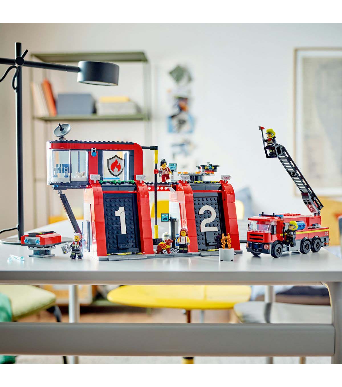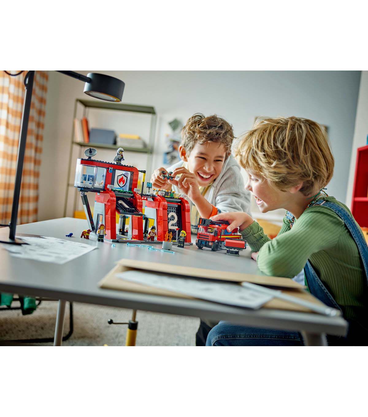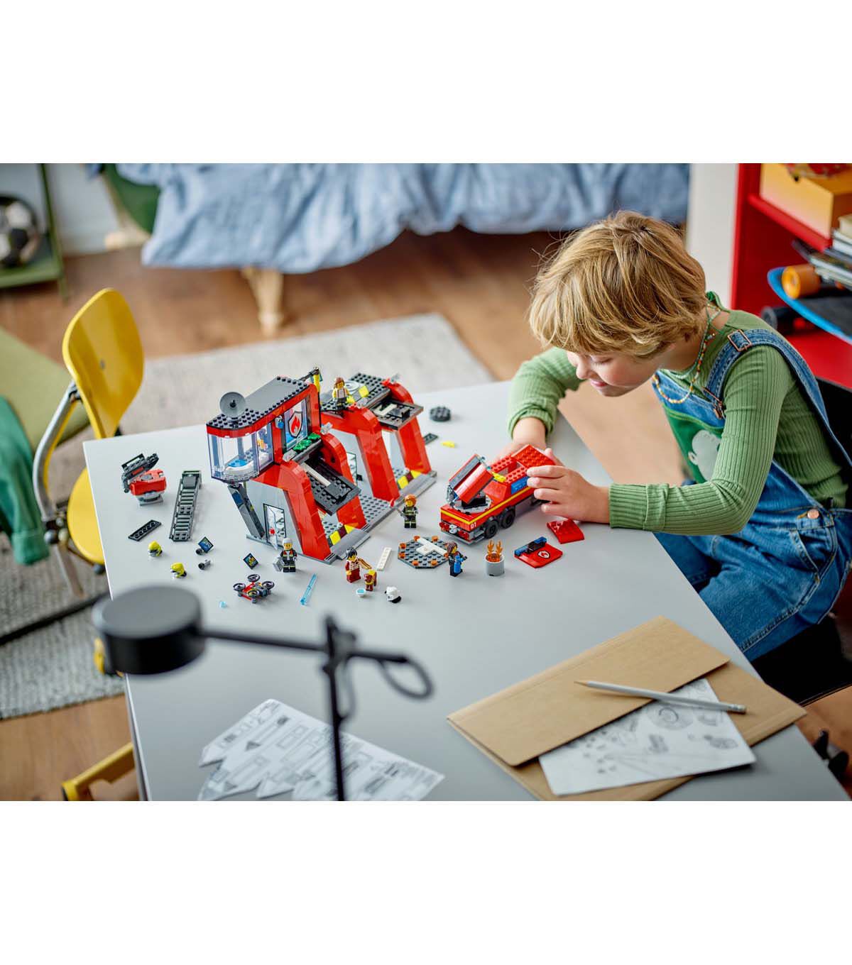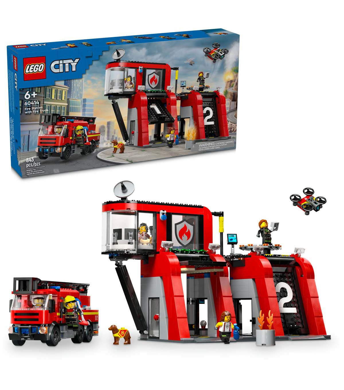 Spark kids’ imaginations with the LEGO City Fire Station with Fire Truck (60414) toy playset for ages 6 and up. The station features a modern control center, kitchenette and sleeping quarters above an equipment area and 2 garages with tall up-and-over doors. The set also includes a toy drone and a cool fire engine with a modular ladder and extinguisher attachments. Mobilize the 5 fire-crew minifigures and fire dog figure for hours of action-packed firefighting role play. Kids can use this set with others from the LEGO City range (sold separately) for even bigger adventures! This emergency rescue toy includes an easy-to-follow printed building guide and step-by-step 3D instructions in the LEGO Builder app. Here kids can zoom in and rotate to visualize models from all angles as they build. LEGO City Fire playsets deliver feature-rich land, air and water toys for imaginative play without limits.