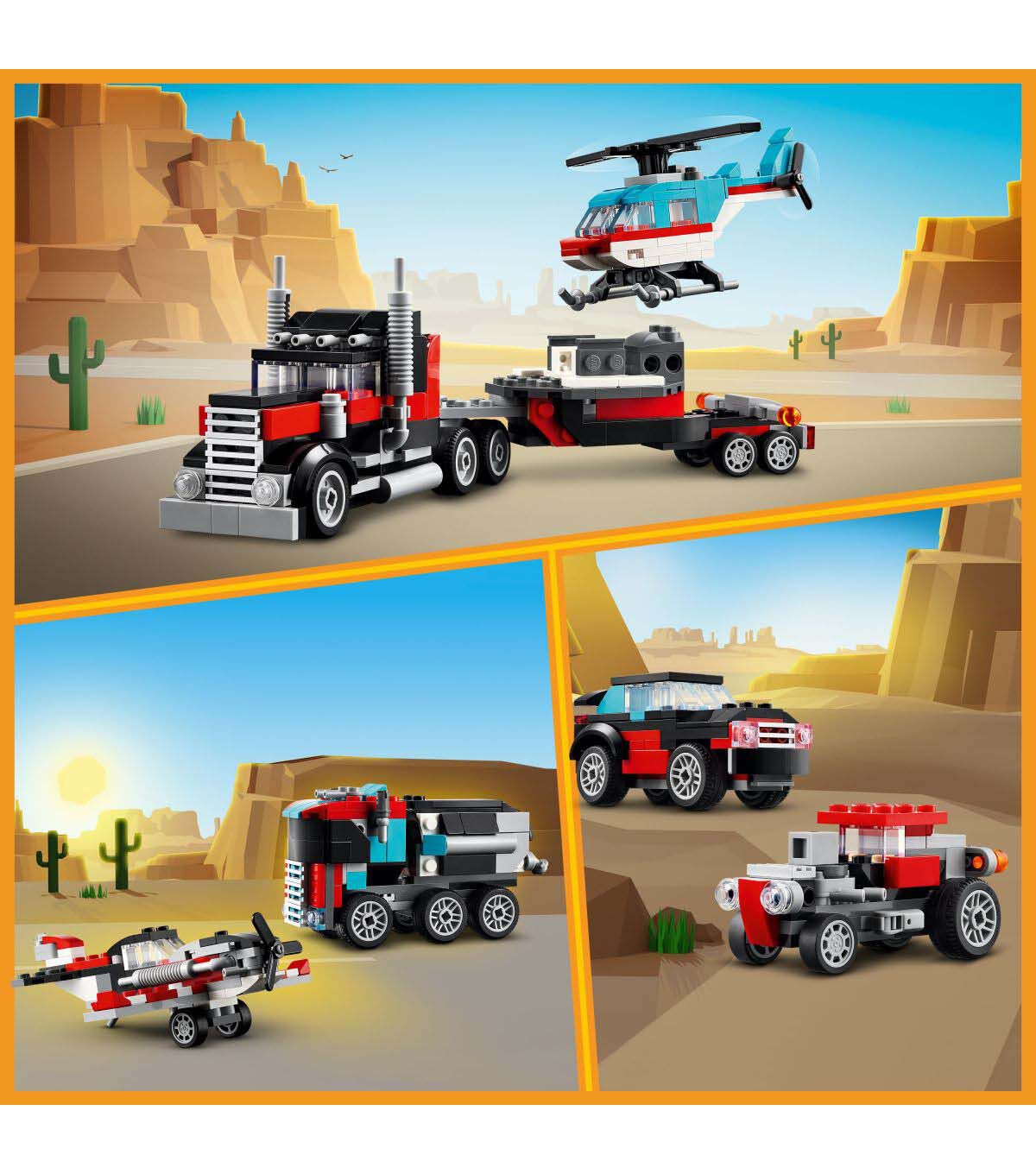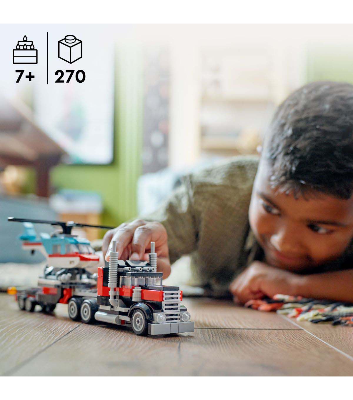 Fast-paced adventures await boys and girls aged 7 and up with the LEGO Creator Flatbed Truck with Helicopter (31146) playset. They can use the 3in1 set’s 270 pieces to build a cool transporter truck toy with moving wheels that can carry a LEGO helicopter with moving rotor blades on its trailer. Kids can build 3 different vehicle toy sets containing 2 separate vehicles with this LEGO Creator 3in1 toy. They have the chance to build the Flatbed Truck with Helicopter, rebuild it into a propeller plane toy and fuel truck with moving wheels, make a hot rod and SUV toy car set for races, or use the bricks to create their own vehicles. LEGO Creator 3in1 toys make great gifts for kids with 3 different models to create in every box. Kids will be excited to build, rebuild and build again. 3in1 sets keep them happy for countless hours and offer a range of models that appeal to their biggest passions, including superfast vehicles, amazing animals and detailed city scenes.