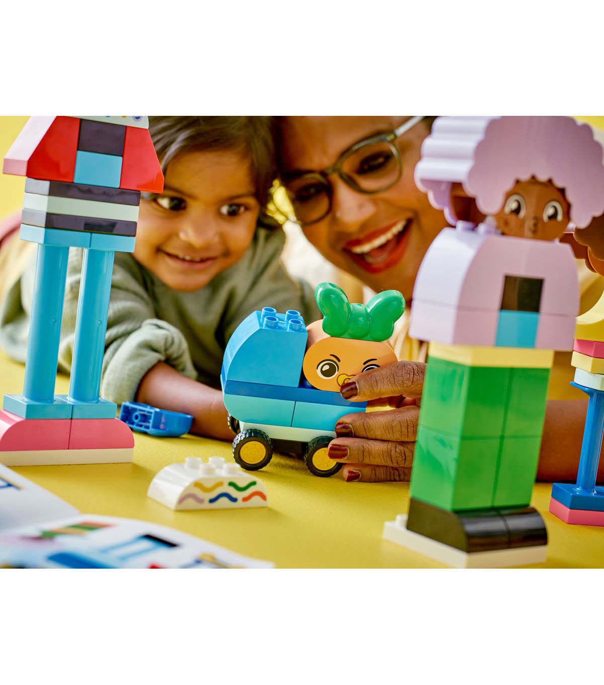 Fill playtimes of toddlers aged 3+ with joyful creativity with the LEGO DUPLO Town Buildable People with Big Emotions (10423). Curious toddlers recognize that people come in all shapes and sizes, and this friendship toy helps them understand that while we all look very different, we can all be friends. This customizable toy comes with 71 bricks and pieces to make 5 buildable characters, including 5 wig bricks and 1 wheelbase. Toddlers’ imaginations take flight as they mix and match toy bodies, legs, faces and hair to create an endless array of friendly characters. With 10 different face bricks, toddlers can express how their characters feel and describe what those expressions mean. The set also provides the perfect conversation prompt for grown-ups to talk to toddlers about how everyone is awesomely different! This building toy comes with colored bricks in interesting shapes that are engaging for little fingers to explore, putting open-ended creativity into the hands of toddlers.