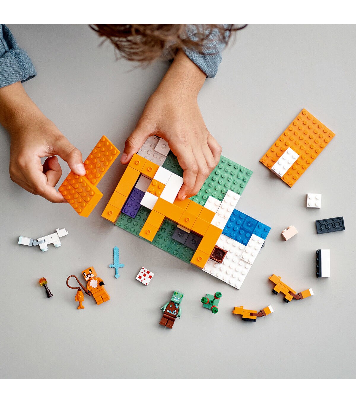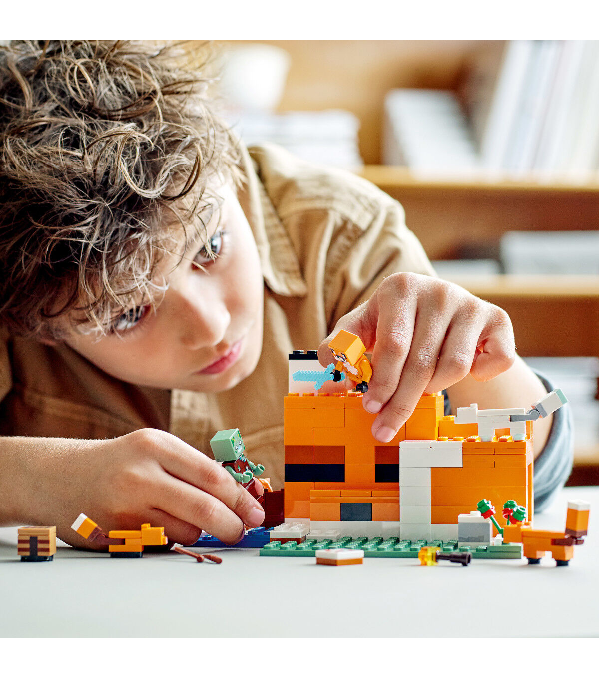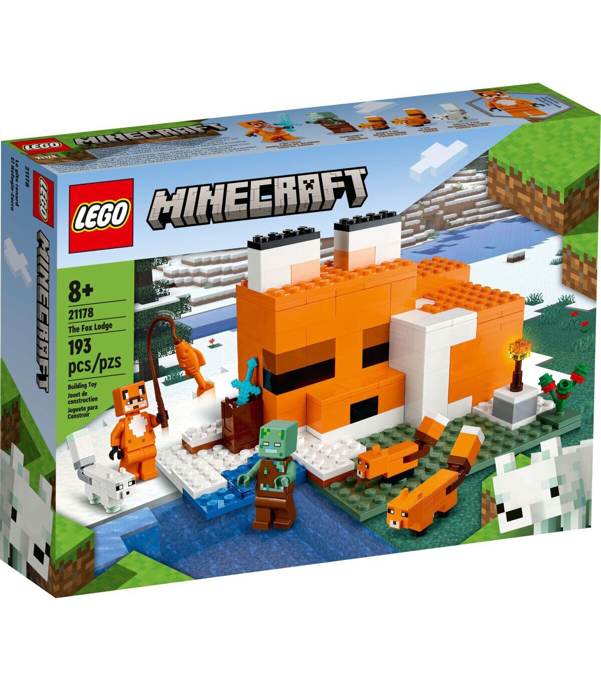 A variety of cool characters, authentic accessories and endless play possibilities make LEGO Minecraft The Fox Lodge (21178) an ideal gift for kids aged 8+. A busy day at the fox house Kids use their Minecraft skills to build a house designed like a sleeping fox. The structure’s open back and lift-off roof make it easy for them to arrange the furniture and enjoy imaginative role play inside. Outside there’s a baby fox, adult fox and Arctic fox for them to feed with berries before the animals curl up to sleep. A popular character from the game, the drowned zombie, arrives to wreak havoc. Kids must fend it off with a sword before exchanging it for a rod and enjoying a spot of fishing.