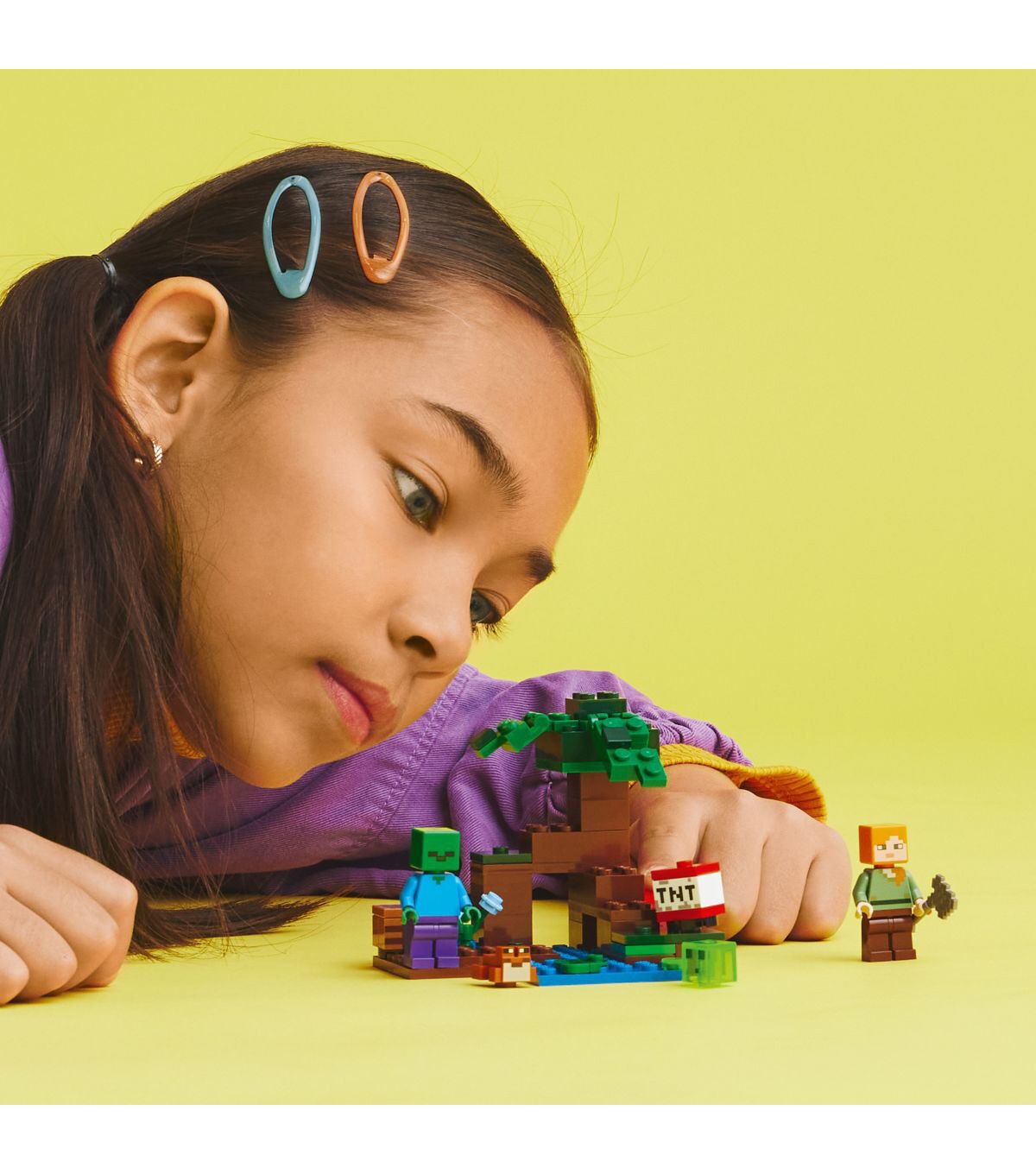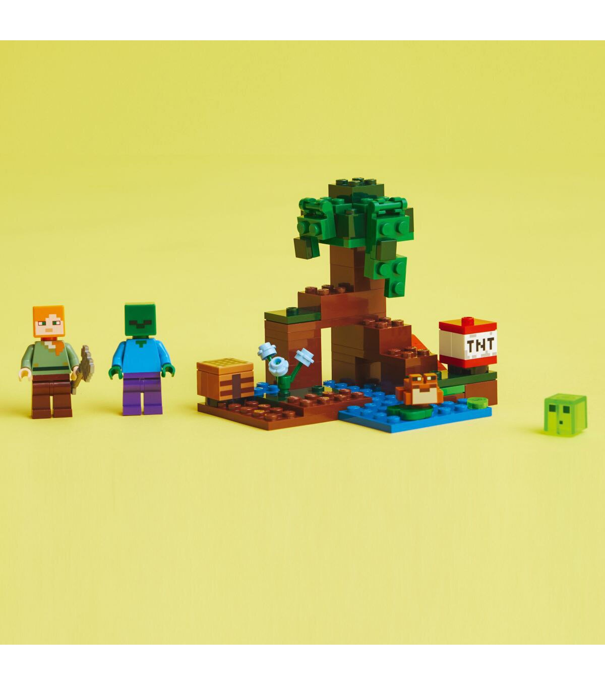 - Iconic characters – Includes familiar Minecraft favorites Alex, a zombie, a slime block and a frog in a swamp biome complete with a mangrove tree, crafting table, axe and exploding TNT function