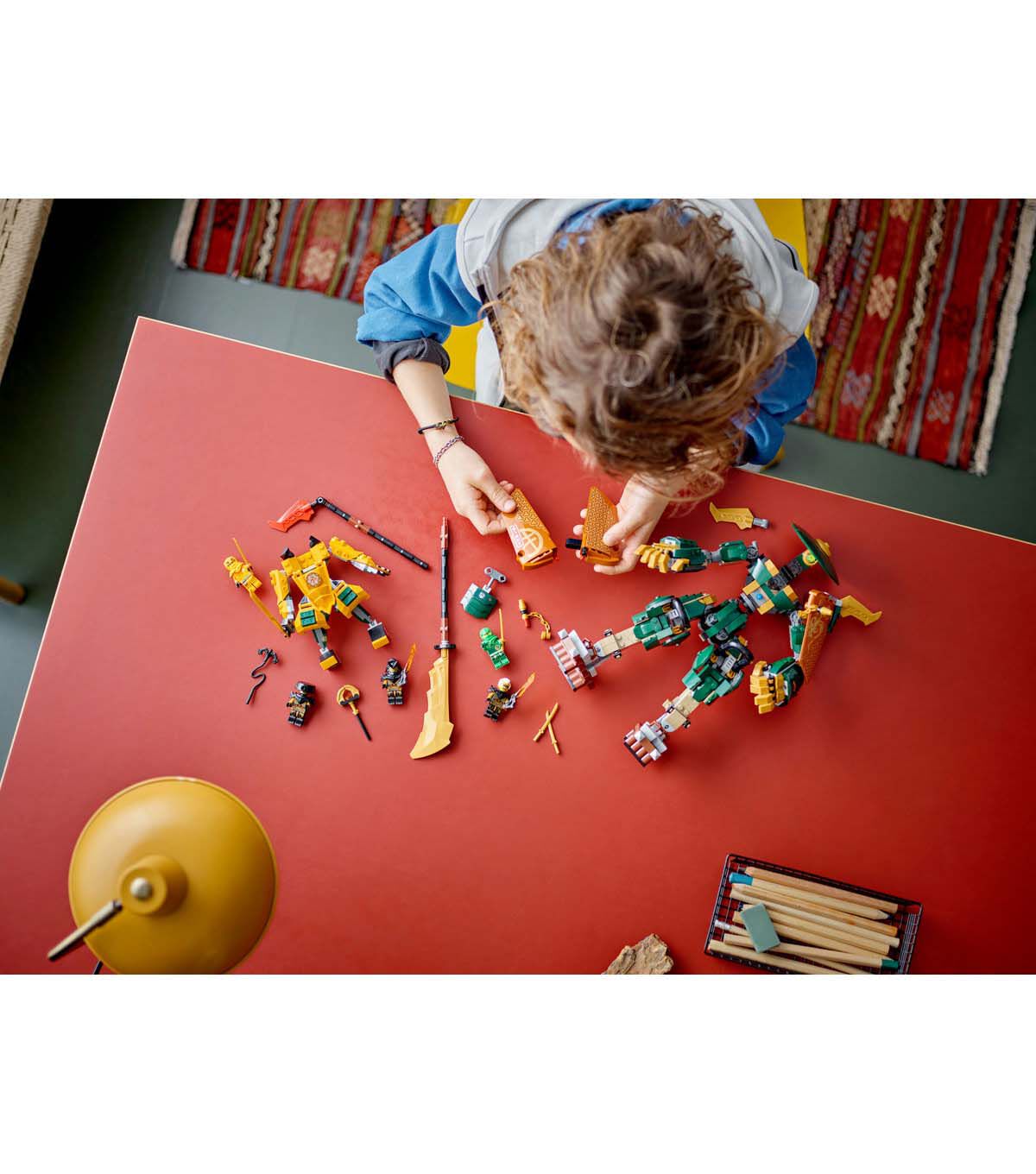 Kids aged 9+ can play out exhilarating training and battle scenes from the NINJAGO Dragons Rising TV series with Lloyd and Arin’s Ninja Team Mechs (71794). This never-before-seen building set features ninja master Lloyd’s and his student Arin’s posable mechs, which can be merged to create 1 larger and heavily armed mech for endless play opportunities. 5 minifigures for epic battles This mech playset comes with 5 minifigures. Ninja master Lloyd is armed with 2 katanas, while his ninja student Arin has 2 katanas and a grappling hook. They can battle the evil trio of Rapton, who is armed with an Imperium sword, Imperium Guard Commander, who comes with a staff, and Imperium Claw General with an Imperium sword. This set gives kids all they need to role-play countless action-packed clashes. LEGO Builder app Let the LEGO Builder app guide you and your child on an easy and intuitive building adventure. Zoom in and rotate models in 3D, save sets and track your progress.