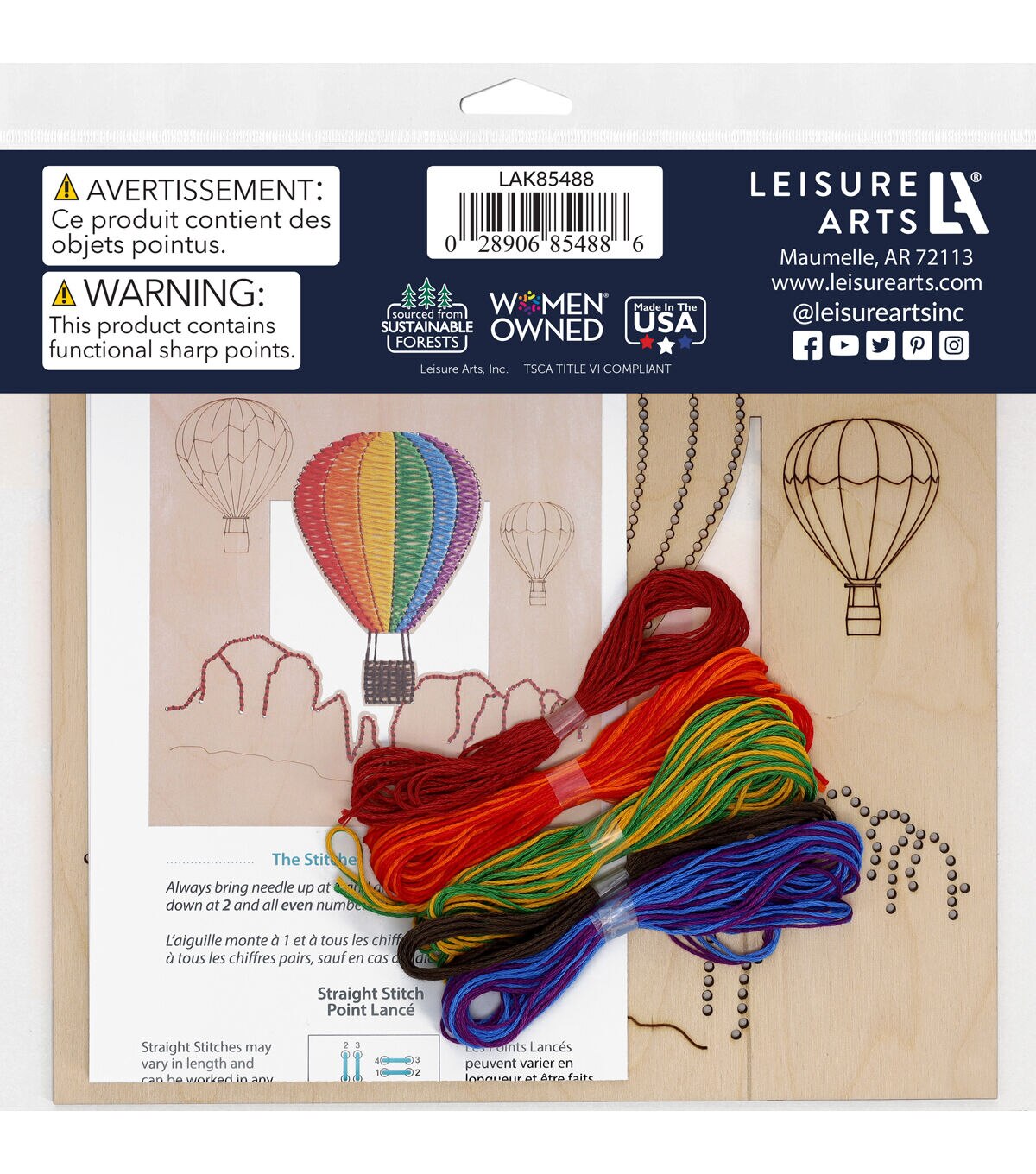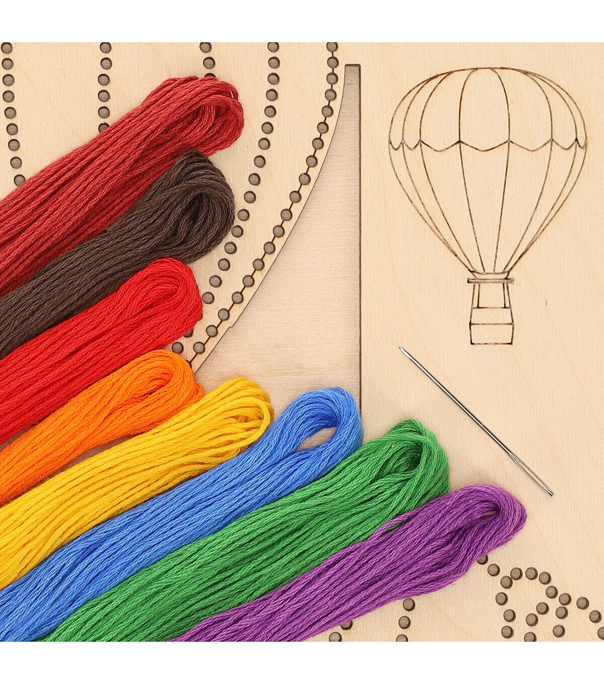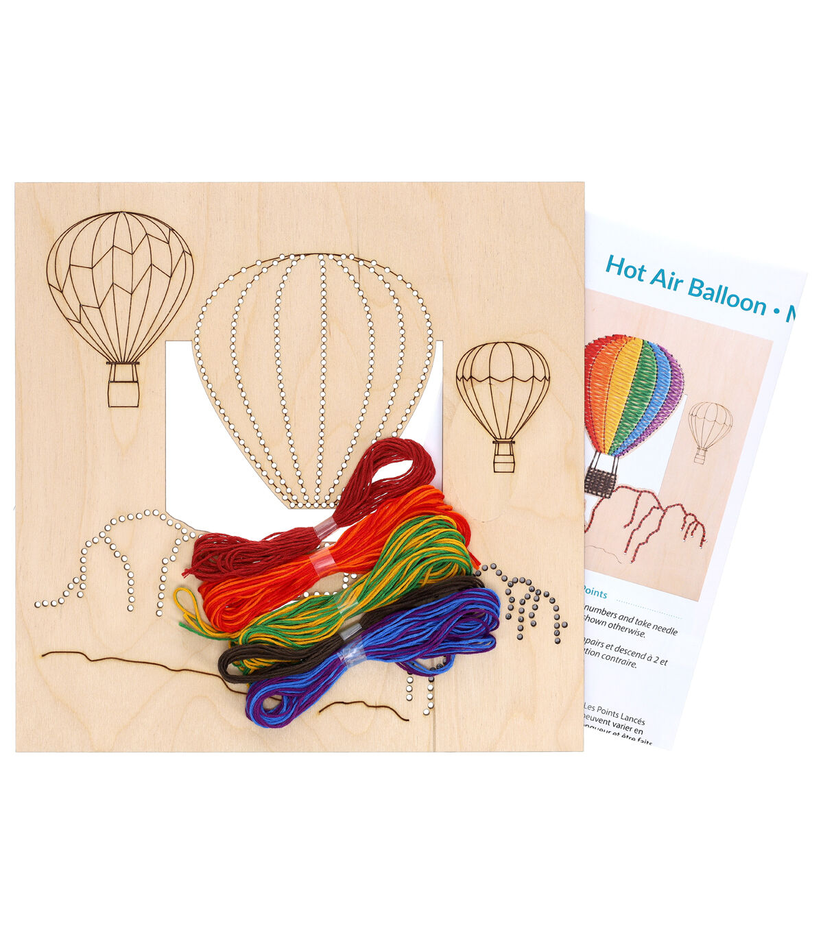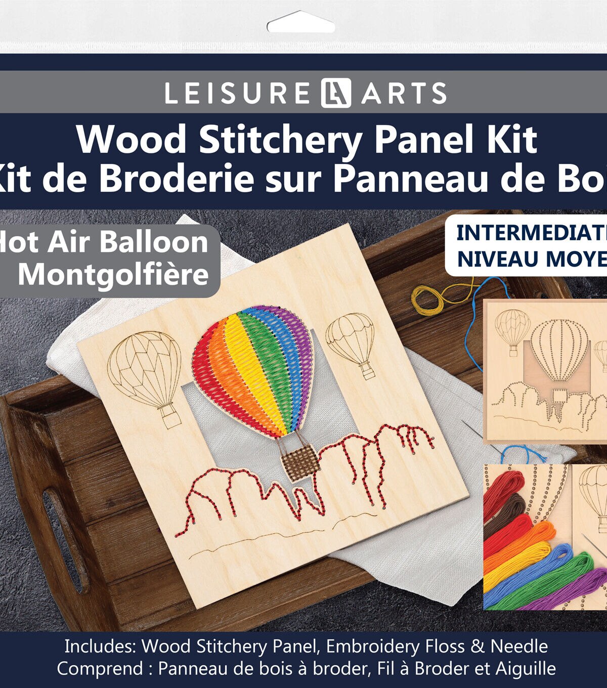 Leisure Arts Kit Wood Stitchery 9.75" Hot Air Balloon Panel- Contains: wood stitchery panel, embroidery floss and needle. Includes step-by-step instructions and a guide to straight, stem and backstitch stitches. Follow the color stitch guide or create your own design with the colors provided. Wood panel measures approximately 9.75"x 9.75". Intermediate skill level.
