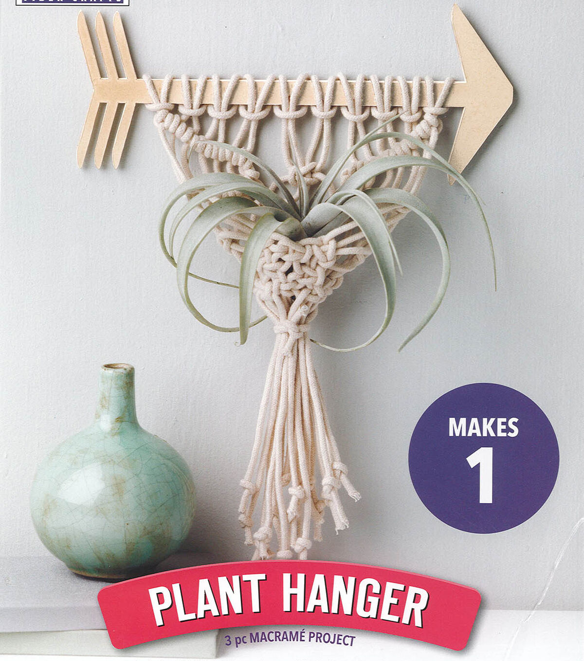 - Mini Maker Macrame Arrow Plant Hanger- Macrame kit contains: 10" slat wood arrow with stained edges, 13 yards of natural cord, and instructions.
