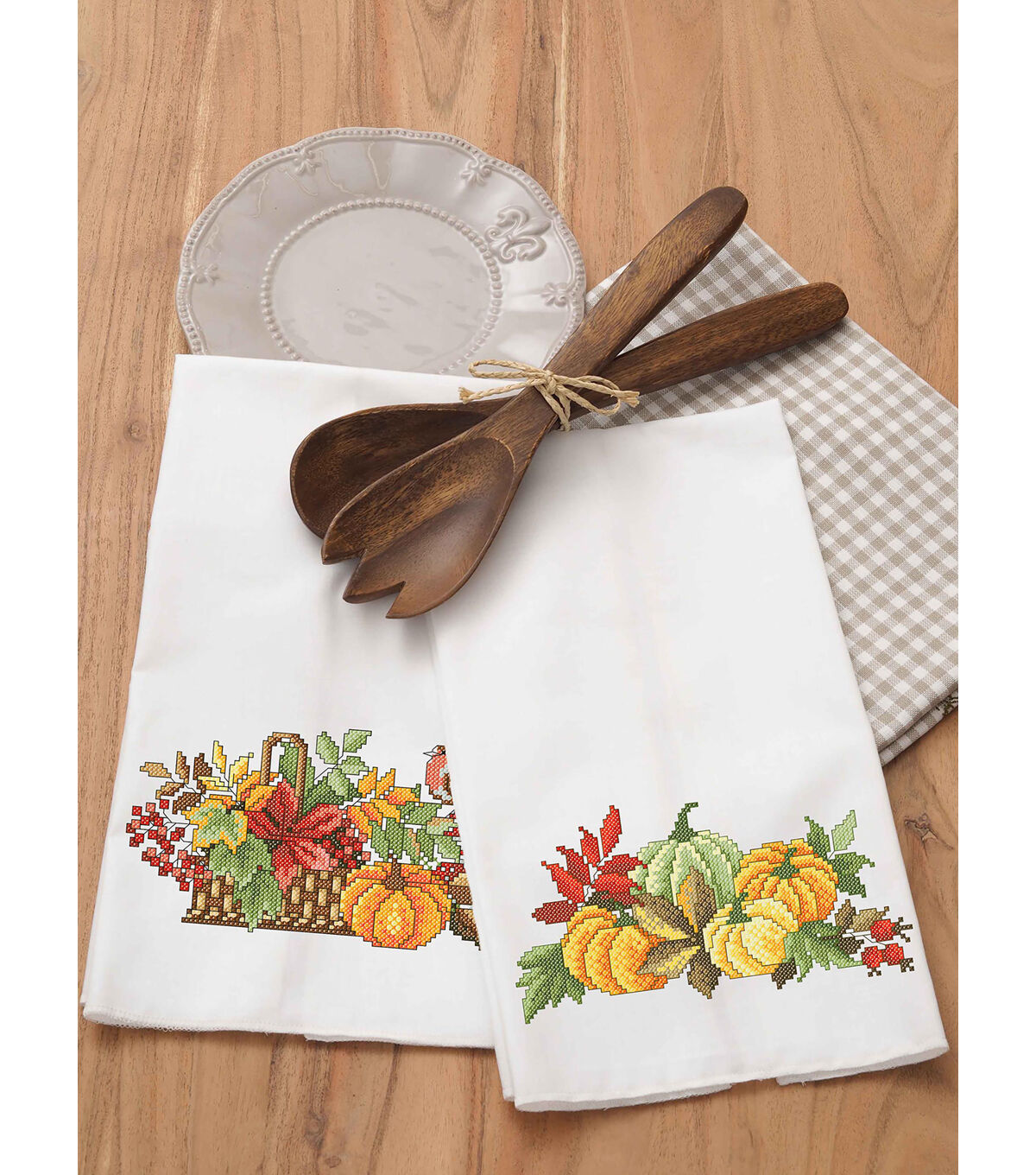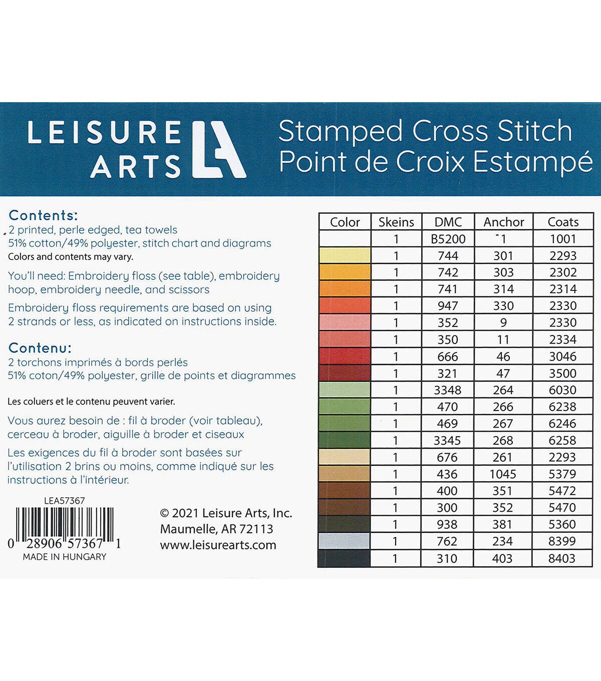 Leisure Arts Kits contain everything you need to create your project unless otherwise stated. Leisure Arts Tea Towel 17x28" Fruits 2pc- Stamped cross stitch design features a collection of fall inspired leaves, pumkins, and berries. Kit includes stamped white, high-quaity percale woven fabric, sistch chart, diagrams, and recommended floss colors. Makes 2 designs. Colors and contents may vary.