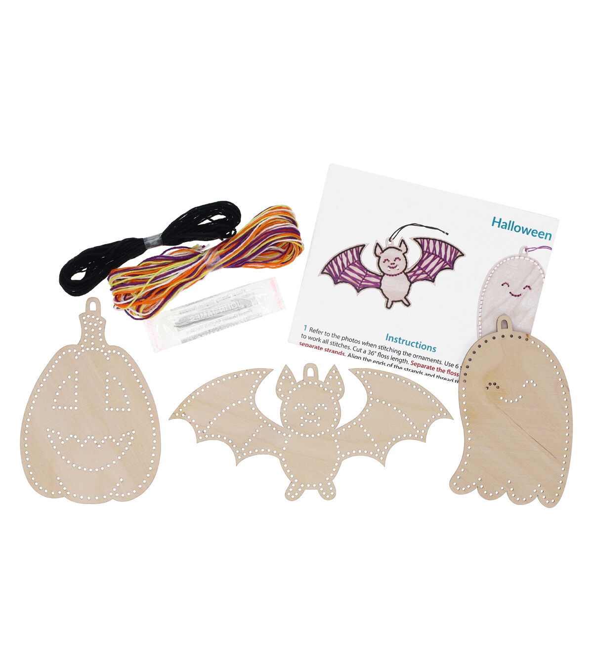Leisure Arts Kit Wood Stitchery Ornaments 4"x 4" Halloween 3pc Set- Contains: 3 wood stitchery shapes, colored floss, and needle. Includes step-by-step instructions and a guide to straight and backstitch stitches. Follow the color stitch guide or create your own design with the colors provided. Ornaments include: ghost, pumpkin, bat, and measure approximately 4.75"x 3.25". Beginner skill level.