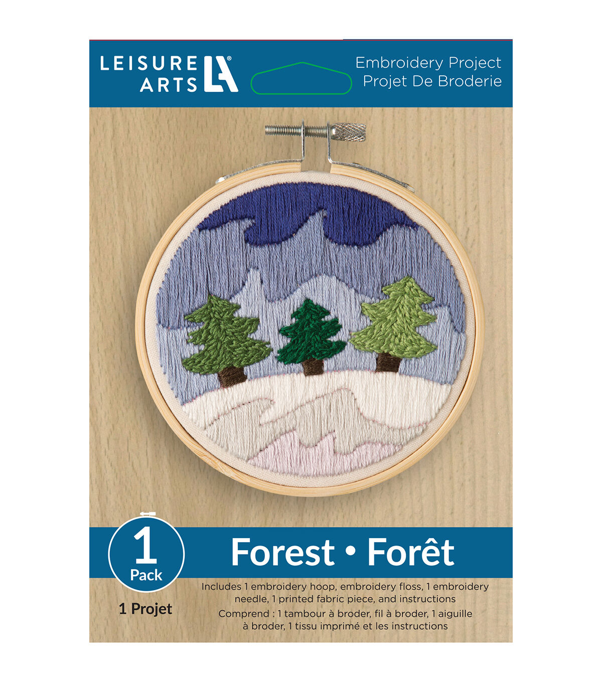 - Leisure Arts Kits contain everything you need to create your project unless otherwise stated. 4" Snowy Forest - Embroidery - design features a wintery scene of snow and pine trees.