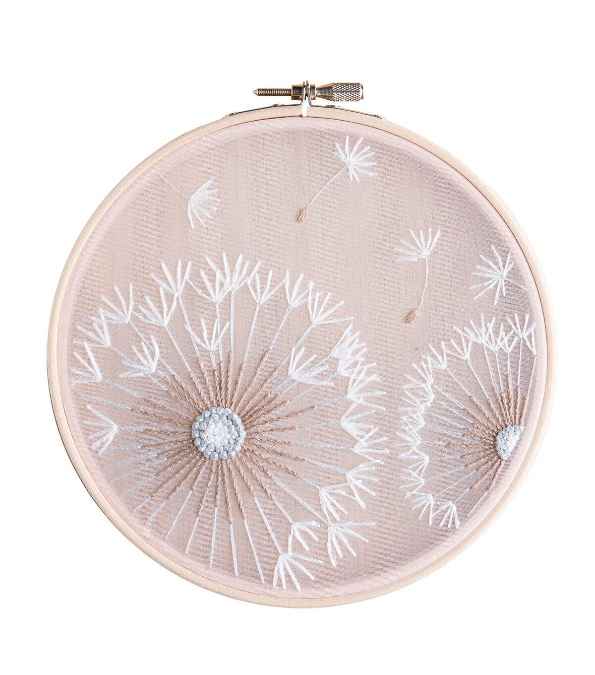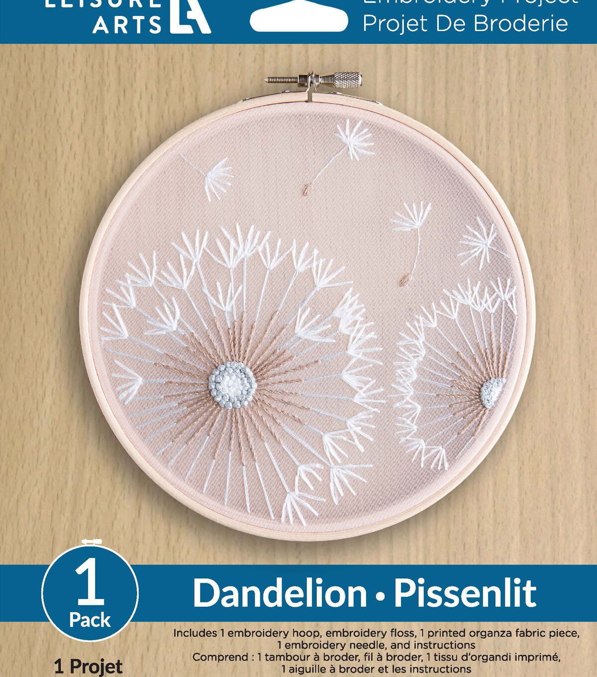 Leisure Arts Kits contain everything you need to create your project unless otherwise stated. Embroidery 6" Dandelion- Printed embroidery design features dandelion flowers stitched on organza fabric. Includes wooden embroidery hoop, embroidery floss, printed organza, embroidery needle and full-color, step-by-step instructions. Use the embroidery hoop to keep the fabric taught and then to display your project. Makes 1 design. Colors and contents may vary.