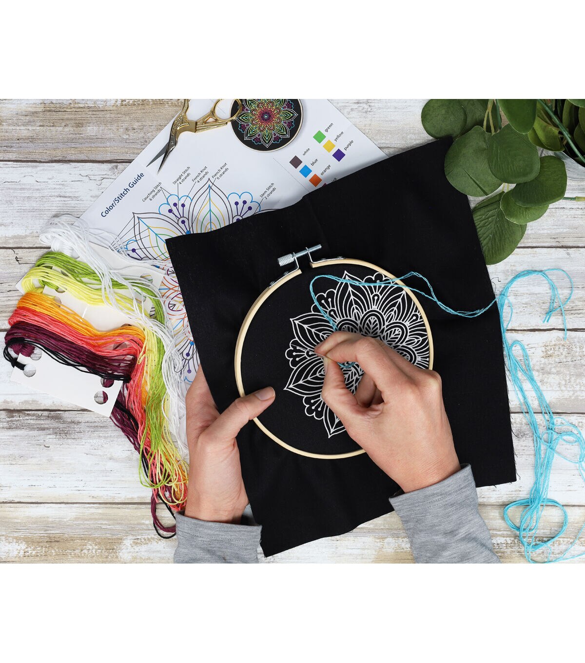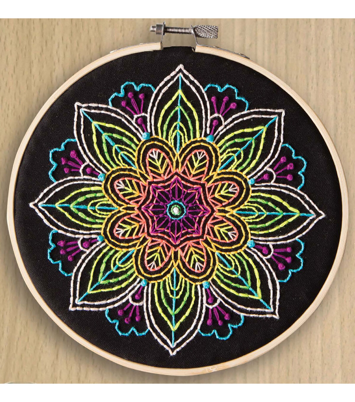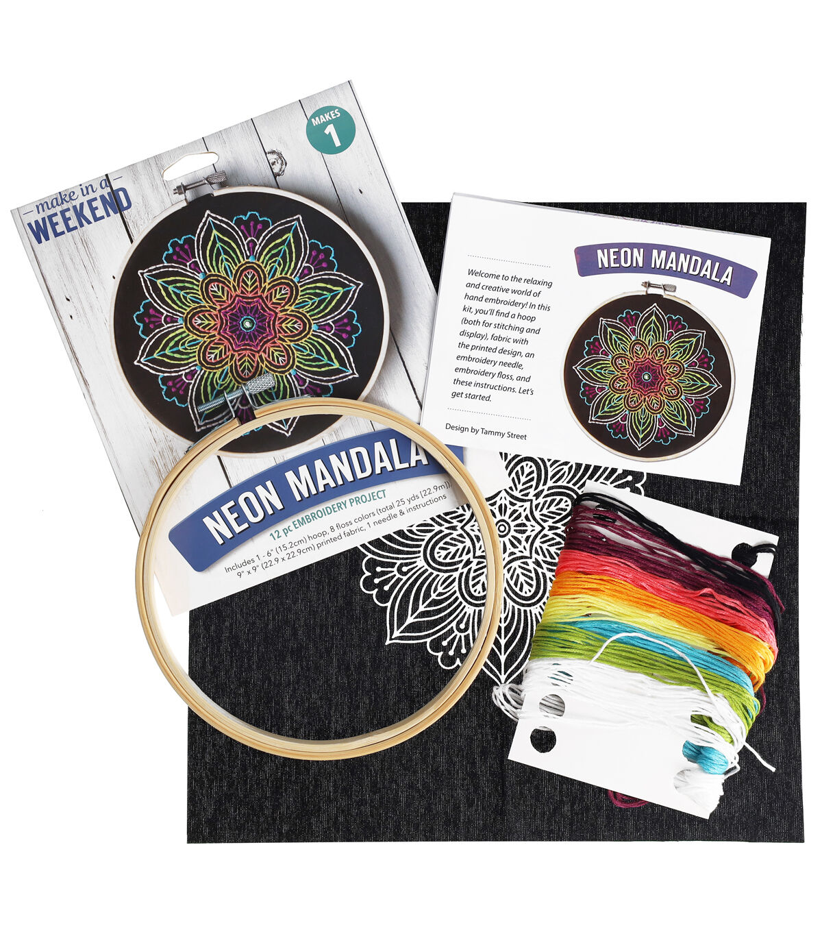 - Contains: 6" embroidery hoop, 8 neon floss colors, 9"x 9" pre-printed black fabric, needle, and easy-to-follow easy-to-follow instructions.