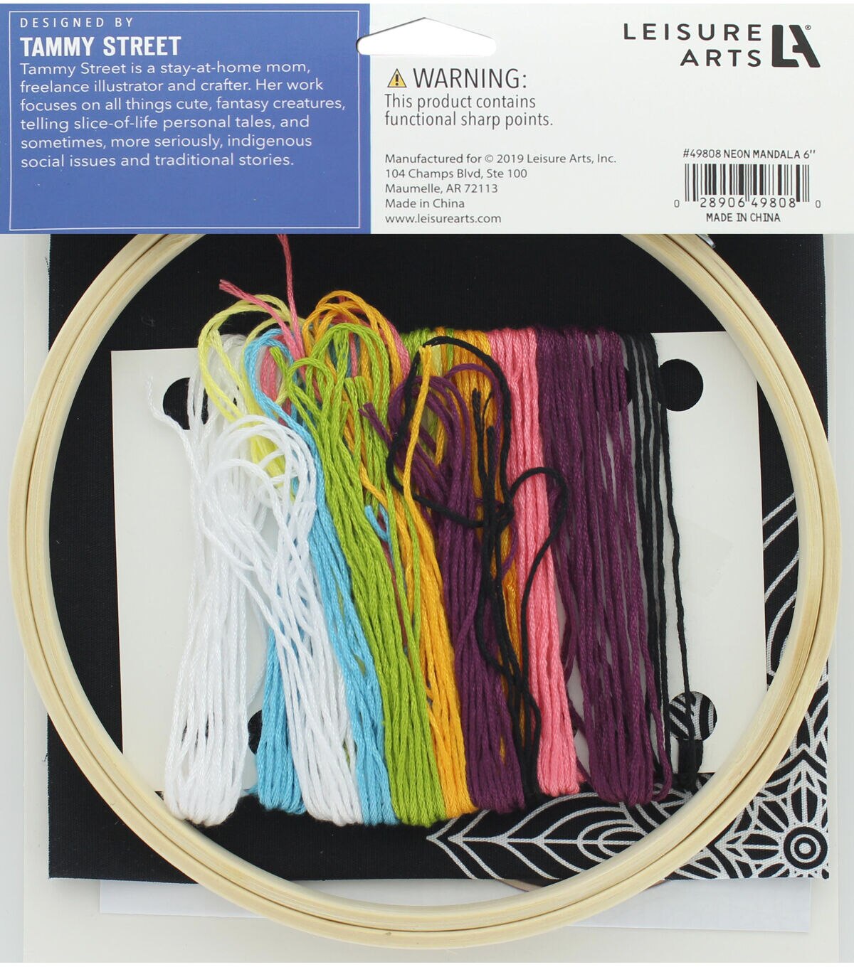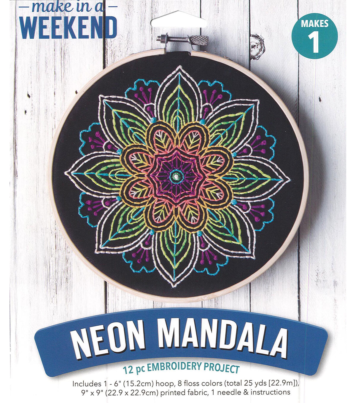 Leisure Arts Kit Embroidery Make In A Weekend 6" Neon Mandala- Mandalas are in, and they’re exquisite, so you and your fingers will delight in every moment of this all-in-one project, with its colorful embroidered threads that pop in a big way on black fabric. Contains: 6" embroidery hoop, 8 neon floss colors, 9"x 9" pre-printed black fabric, needle, and easy-to-follow easy-to-follow instructions. Makes one project. Colors and contents may vary.