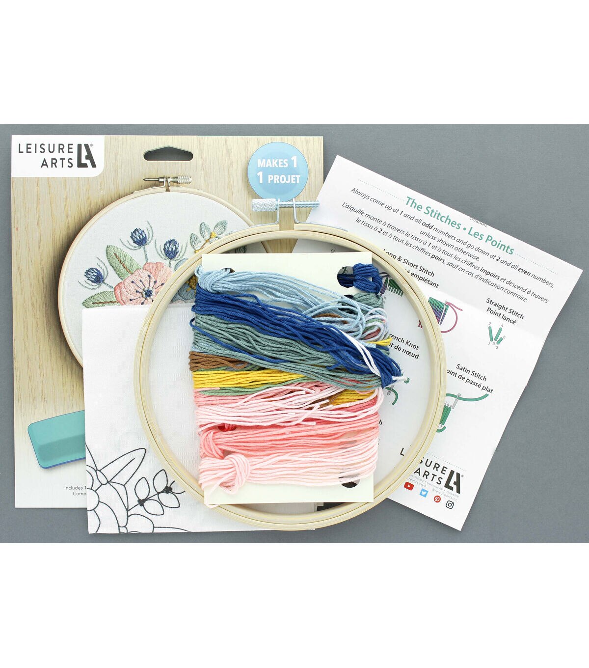Leisure Arts Kit Embroidery 6" Pink Poppies- Embroidery kit contains: 6" embroidery hoop, 10 floss colors, pre-printed fabric, a needle, and instructions. Design is pink poppies with blue accent flowers and green leaves and branches surrounding them.