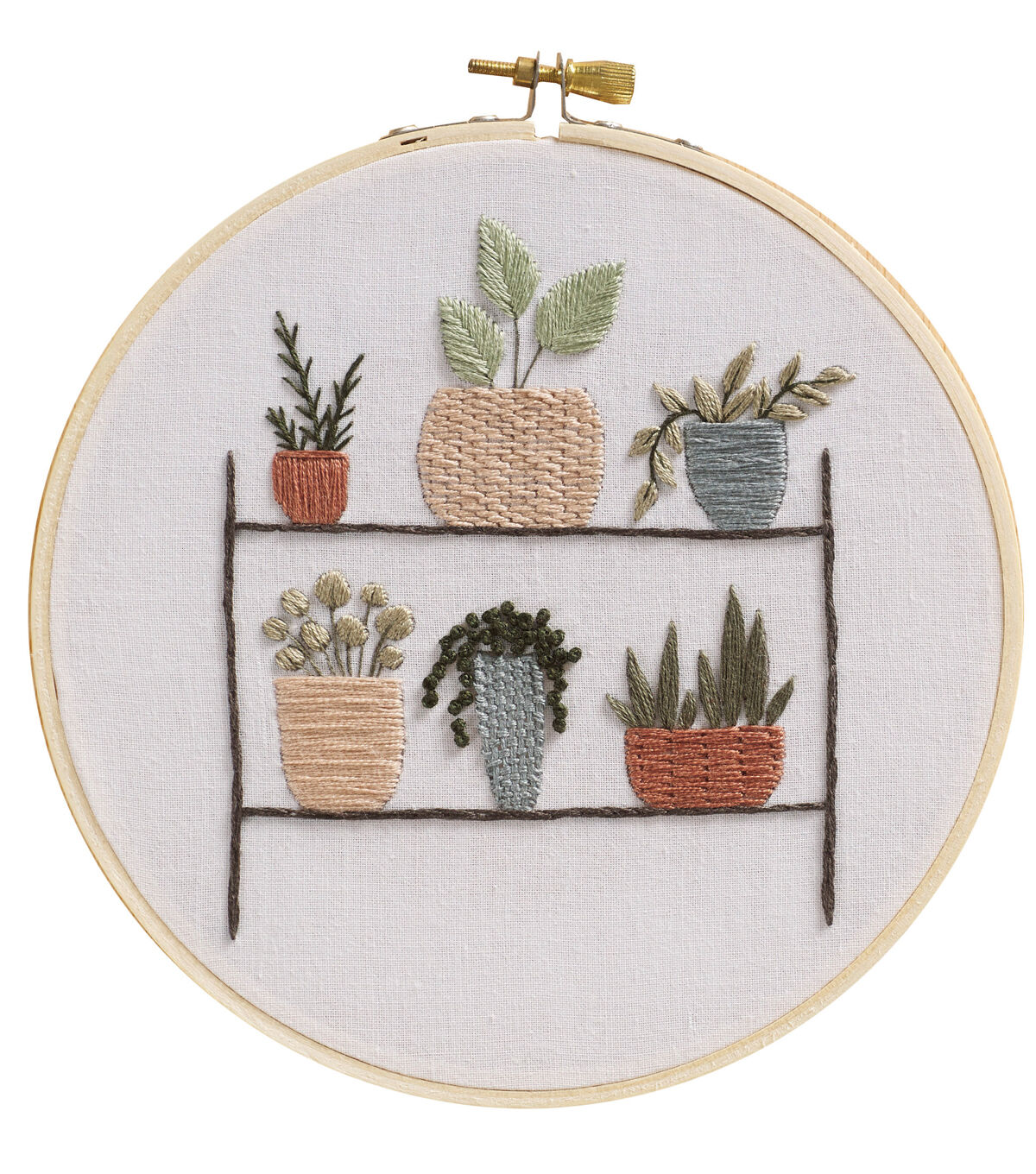 Leisure Arts Kits contain everything you need to create your project unless otherwise stated. Embroidery 6" Plant Shelf- Printed embroidery design features a 2 tier shelf with 6 different potted plants. Includes 1embroidery hoop, embroidery floss, printed fabric, embroidery needle and full-color, step-by-step instructions. Use the embroidery hoop to keep the fabric taught and then to display your project. Makes 1 design. Colors and contents may vary.