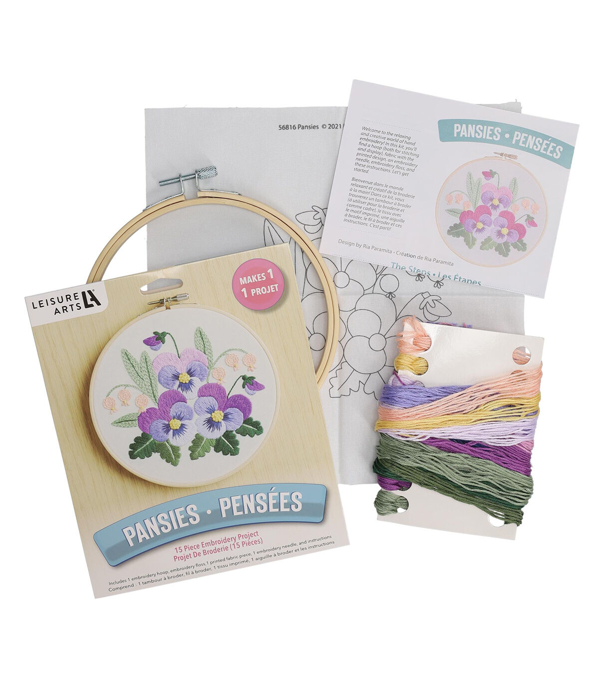 Leisure Arts Embroidery Kit 6" Pansies- Printed embroidery design features 3 purple pansies with layered lily of the valley flowers in the background. Includes 6" wooden embroidery hoop, embroidery floss, printed fabric, embroidery needle and full-color, step-by-step instructions. Use the embroidery hoop to keep the fabric taught and then to display your project. Makes 1 design. Colors and contents may vary.
