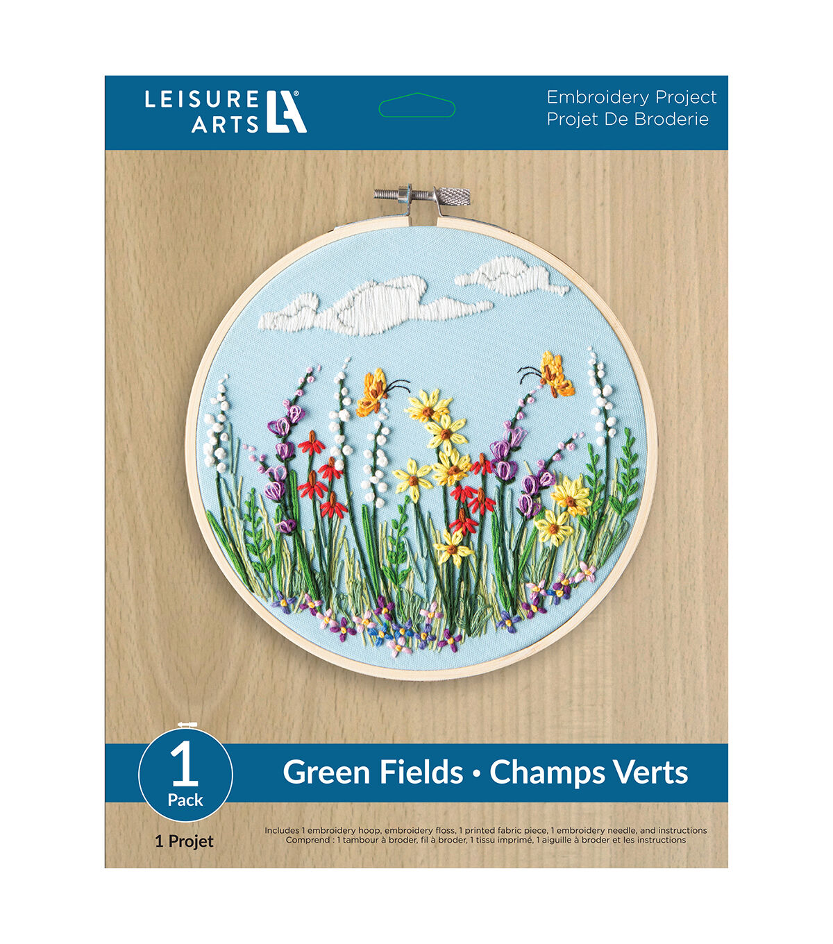 - Leisure Arts Kits contain everything you need to create your project unless otherwise stated. 8" Green Field - Embroicery design features a beautiful wildflowers stitched on blue fabric.