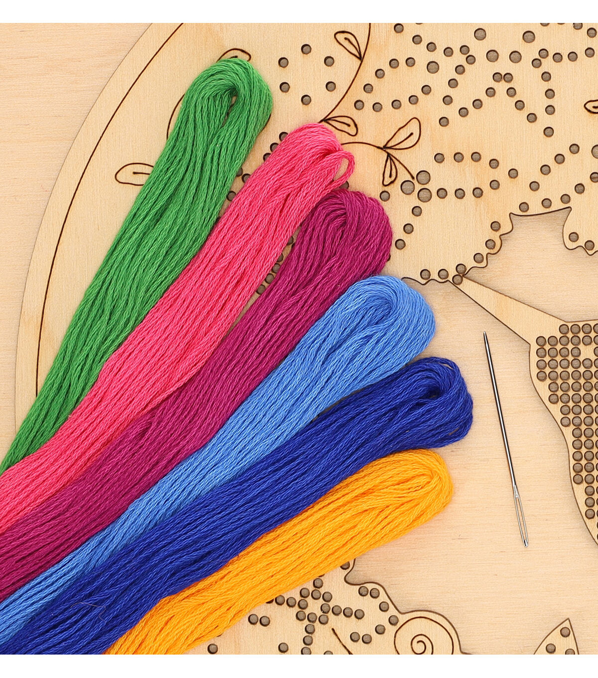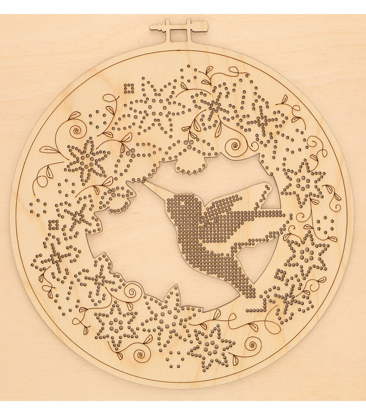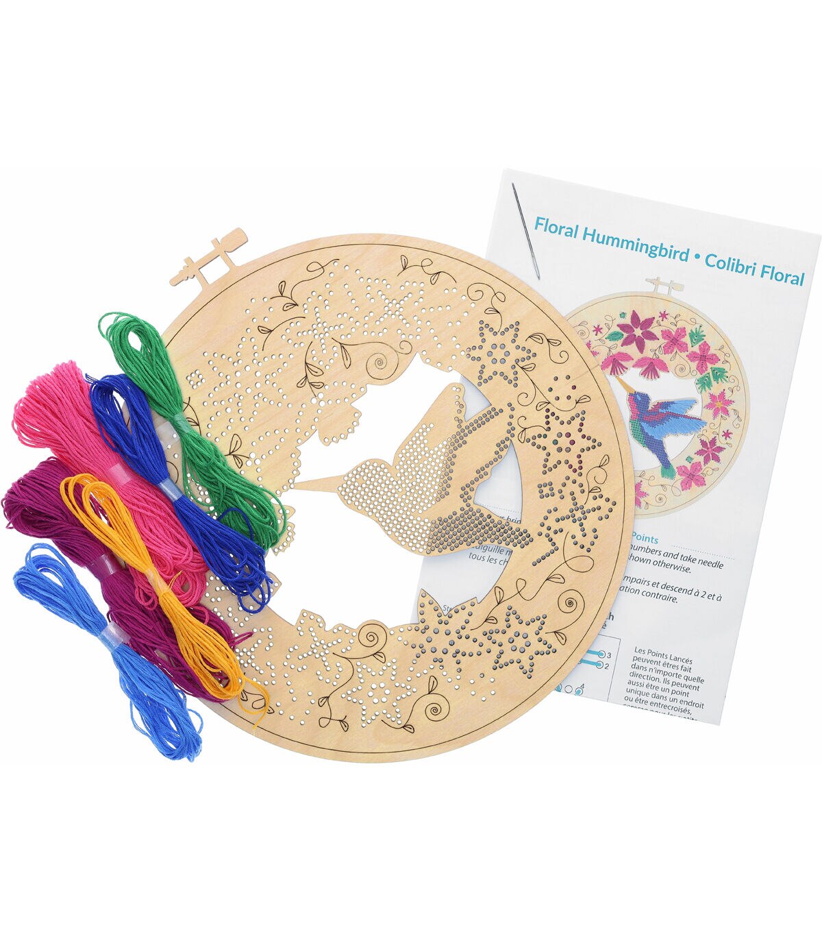 Leisure Arts Kit Wood Stitchery Hoops 9" Floral Hummingbird- Contains: wood stitchery panel, embroidery floss and needle. Includes step-by-step instructions and a guide to straight, stem and backstitch stitches. Follow the color stitch guide or create your own design with the colors provided. Wood shape measures approximately 9" across. Intermediate skill level.