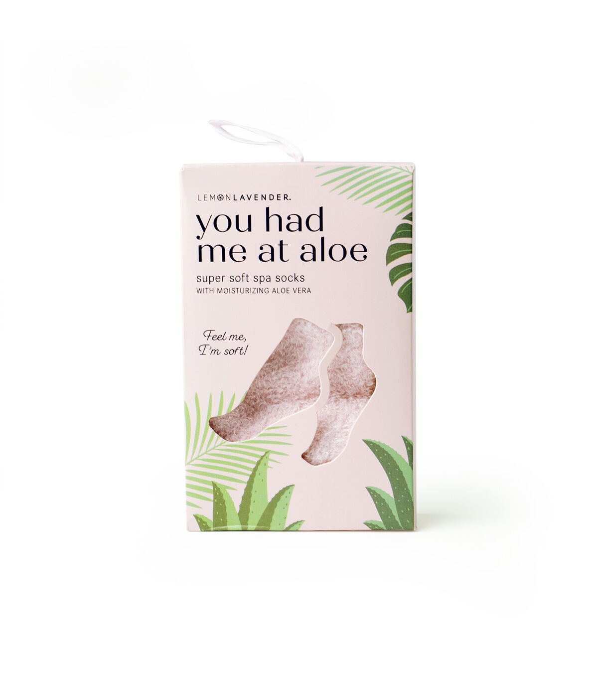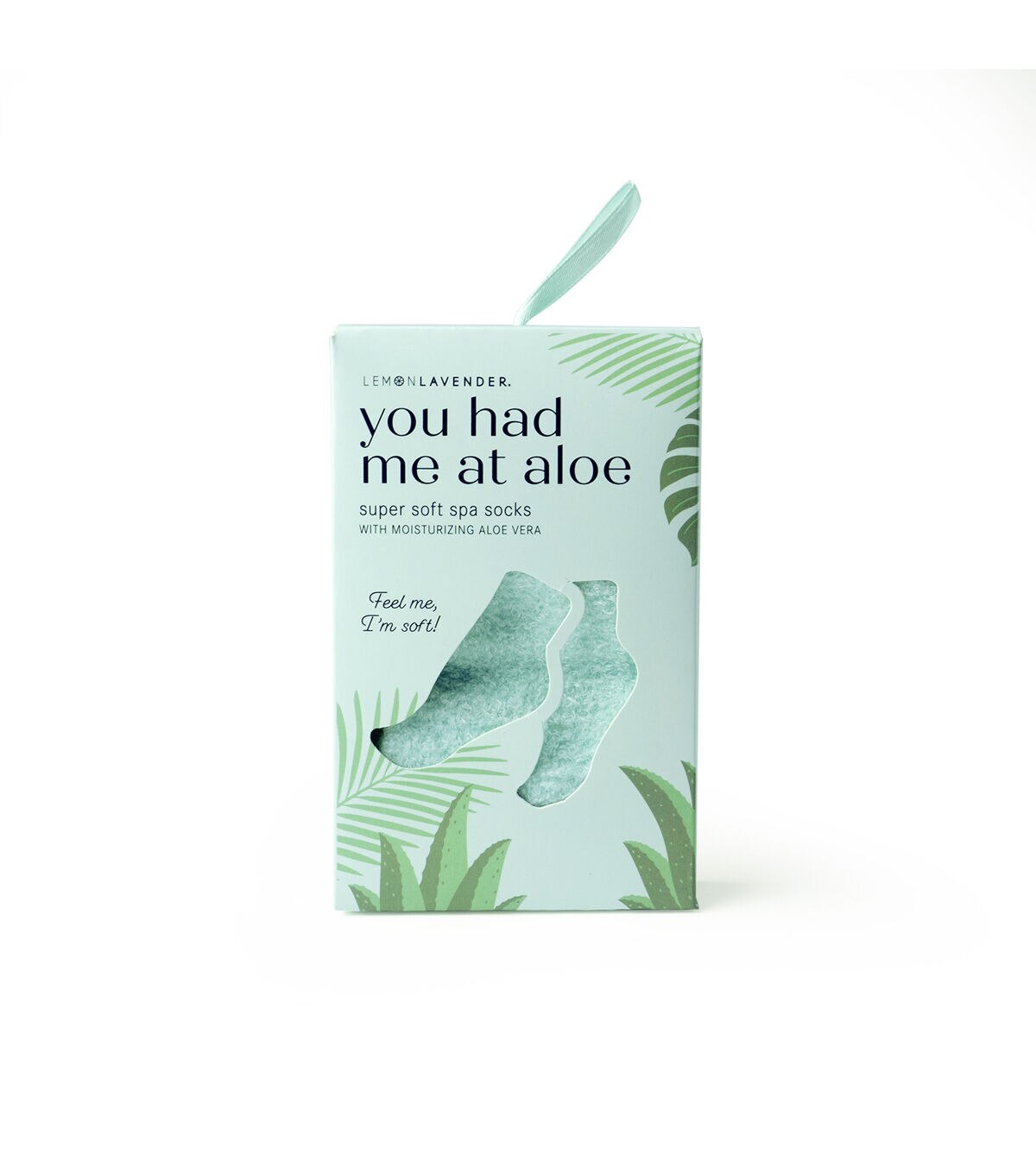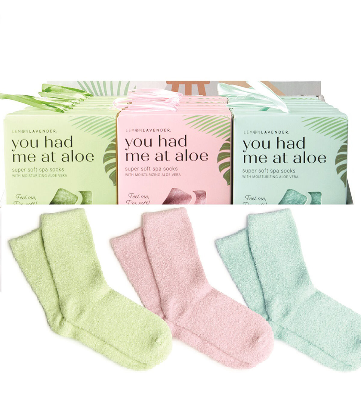 LEMON LAVENDER Super Soft Spa Socks Infused with natural aloe vera, these ultra hydrating socks prevent and soften callouses, and restore moisture to dry, cracked feet. Wear to bed for easy overnight care in between pedis or as part of your regular routine. Super soft fabric infused with aloe vera offers natural hydration and smooths and softens feet. One size fits most. Available in blue, green and pink.