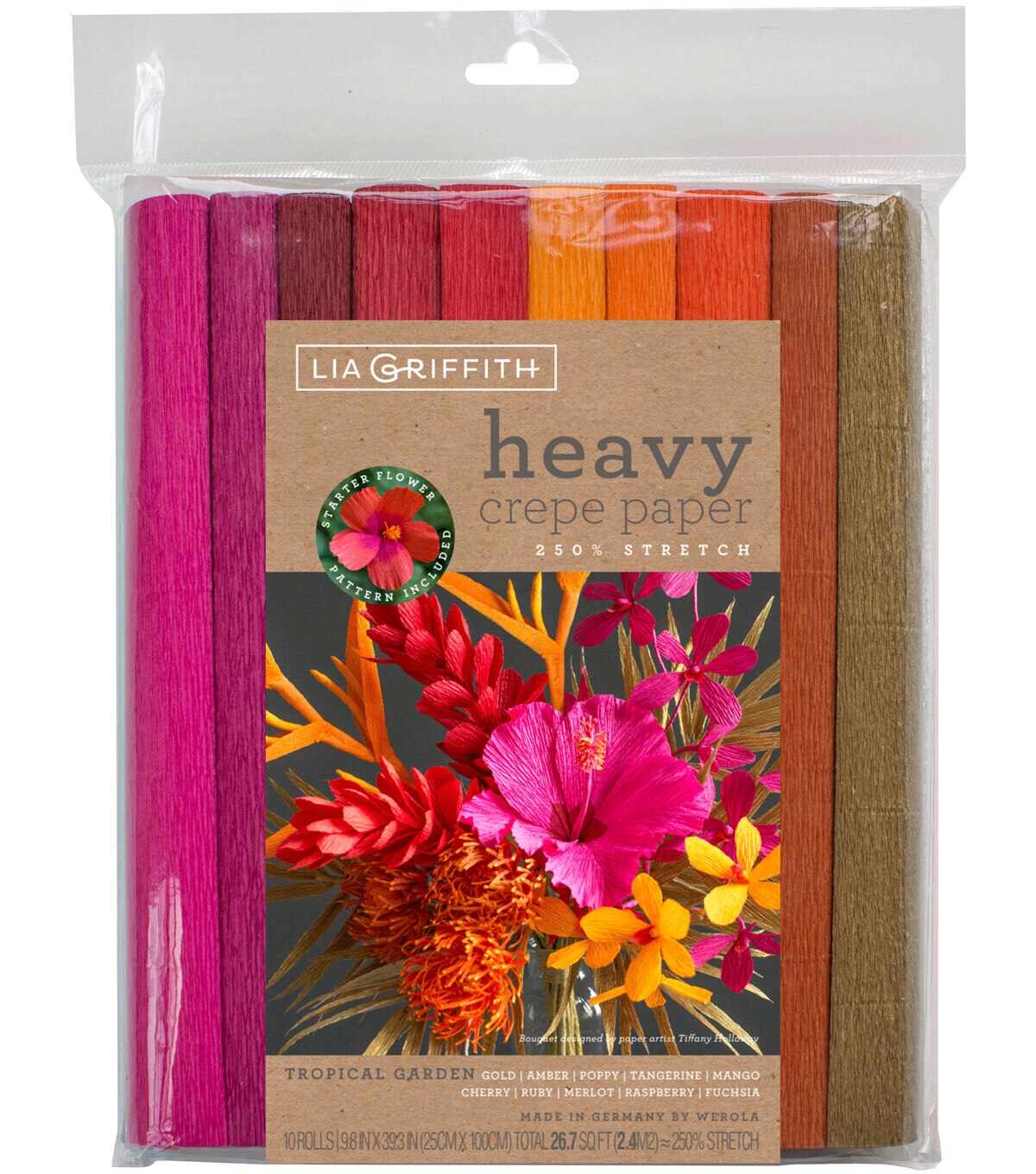 The Lia Griffith Heavy Crepe Papers-Tropical Garden are perfect to make DIY flowers, holiday decorations, wedding and party decorations, kids craft projects and more. This package contains 10 rolls of 9.8 x 39.3-inch non-toxic heavy crepe paper in assorted colors.