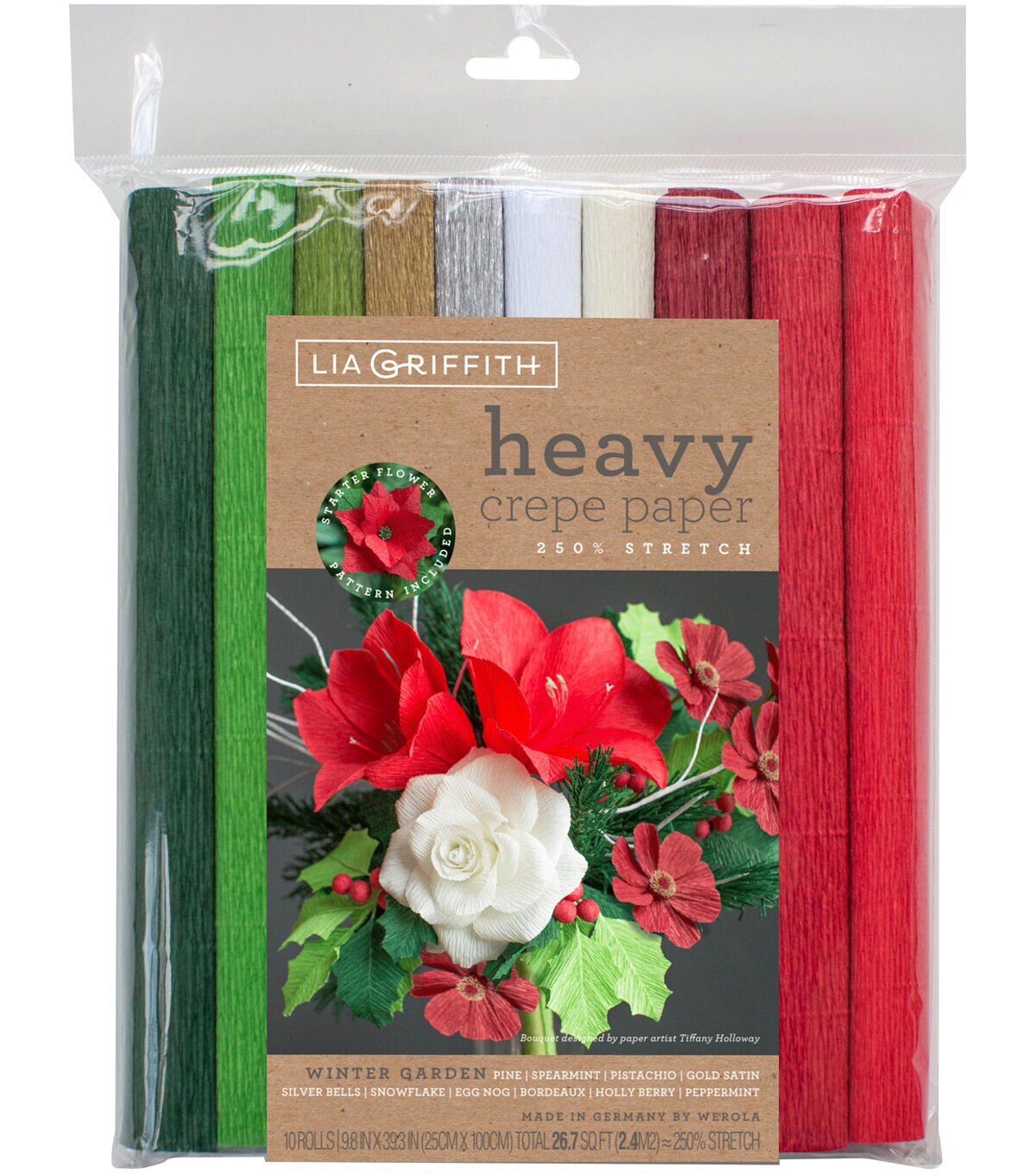 The Lia Griffith Heavy Crepe Papers-Winter Garden are perfect to make DIY flowers, holiday decorations, wedding and party decorations, kids craft projects and more. This package contains 10 rolls of 9.8 x 39.3-inch non-toxic heavy crepe paper in assorted colors.