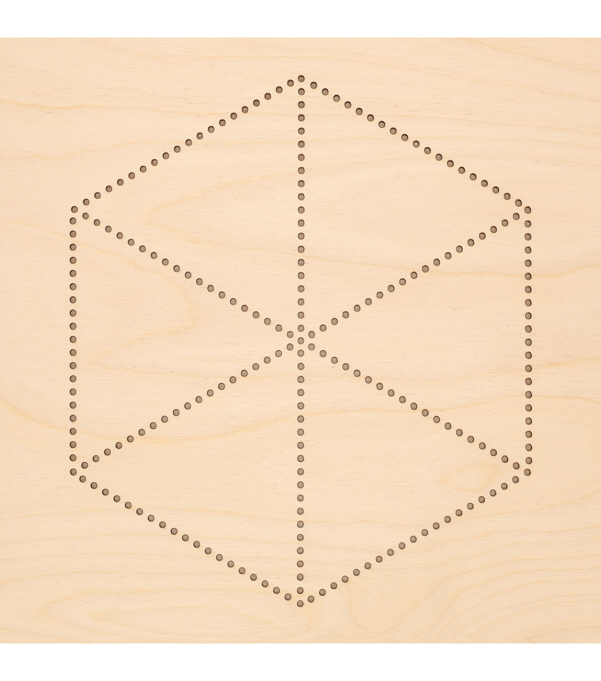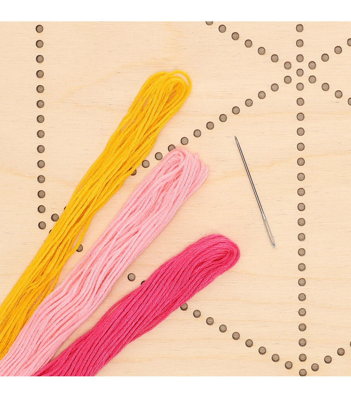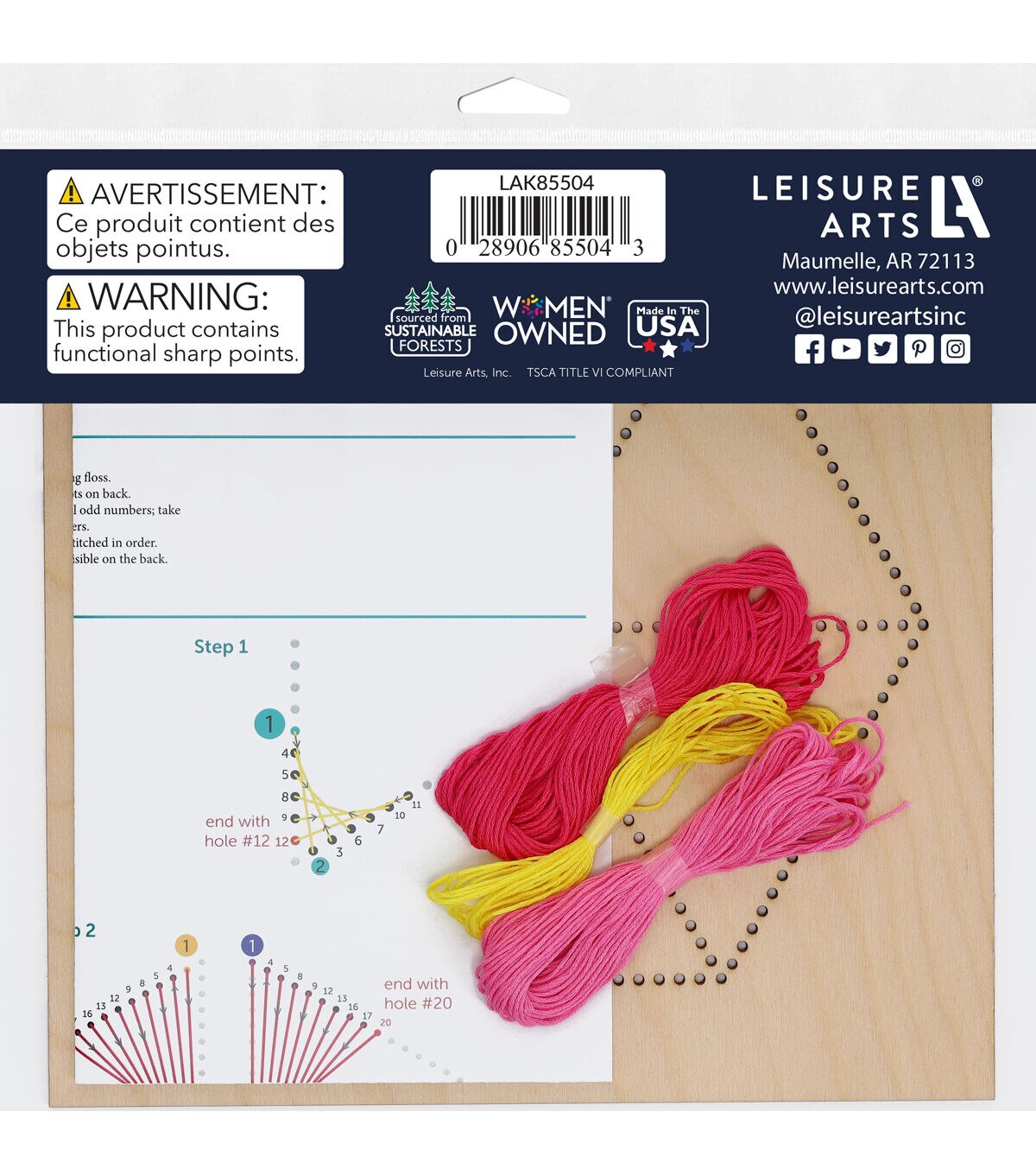 Leisure Arts Kit Wood String Art 9.75"x 9.75" Hexagon Flower Panel- Contains: wood stitchery panel, embroidery floss and needle. Includes step-by-step instructions and a guide to straight, stem and backstitch stitches. Follow the color stitch guide or create your own design with the colors provided. Wood panel measures approximately 9.75"x 9.75". Intermediate skill level.