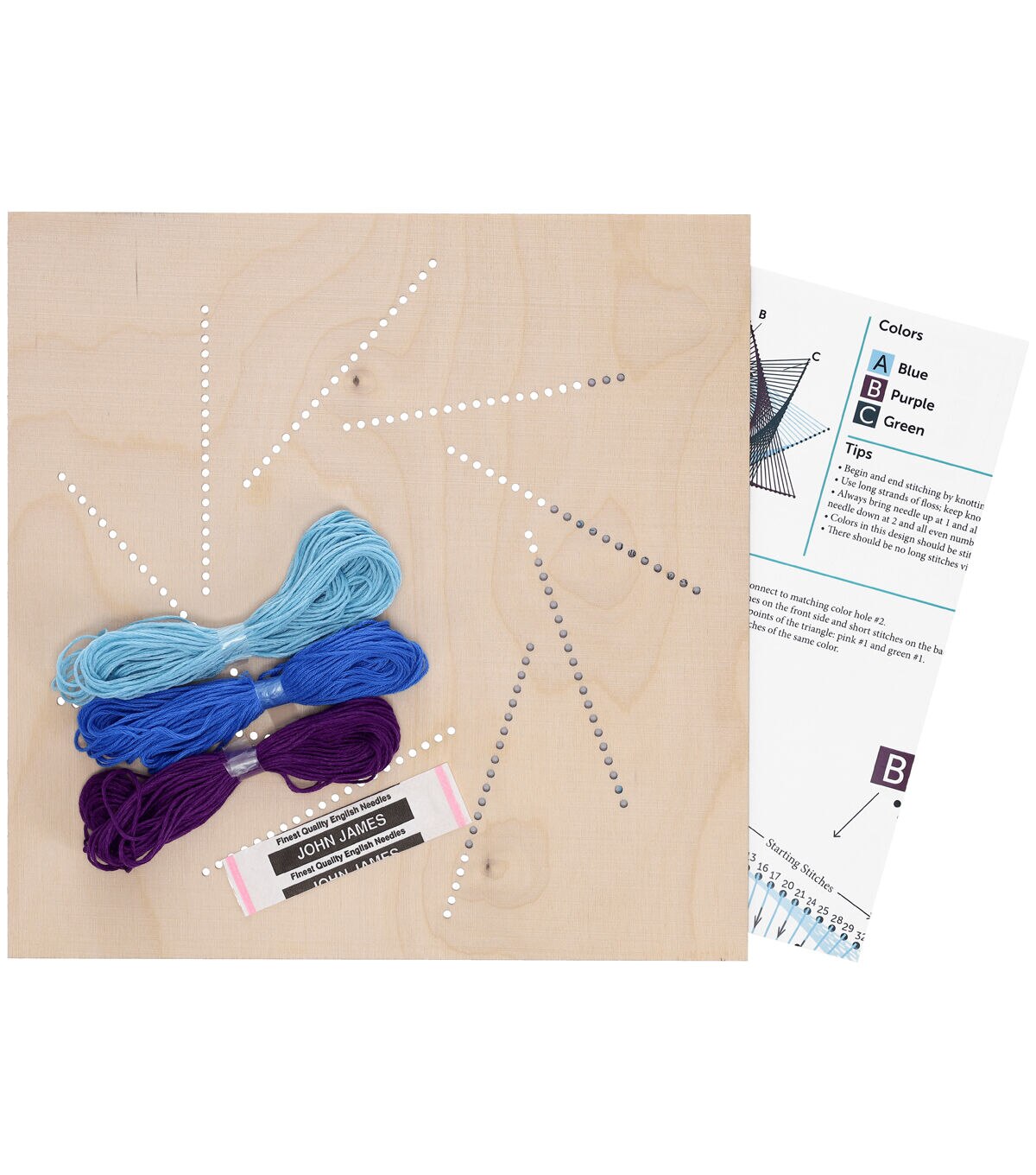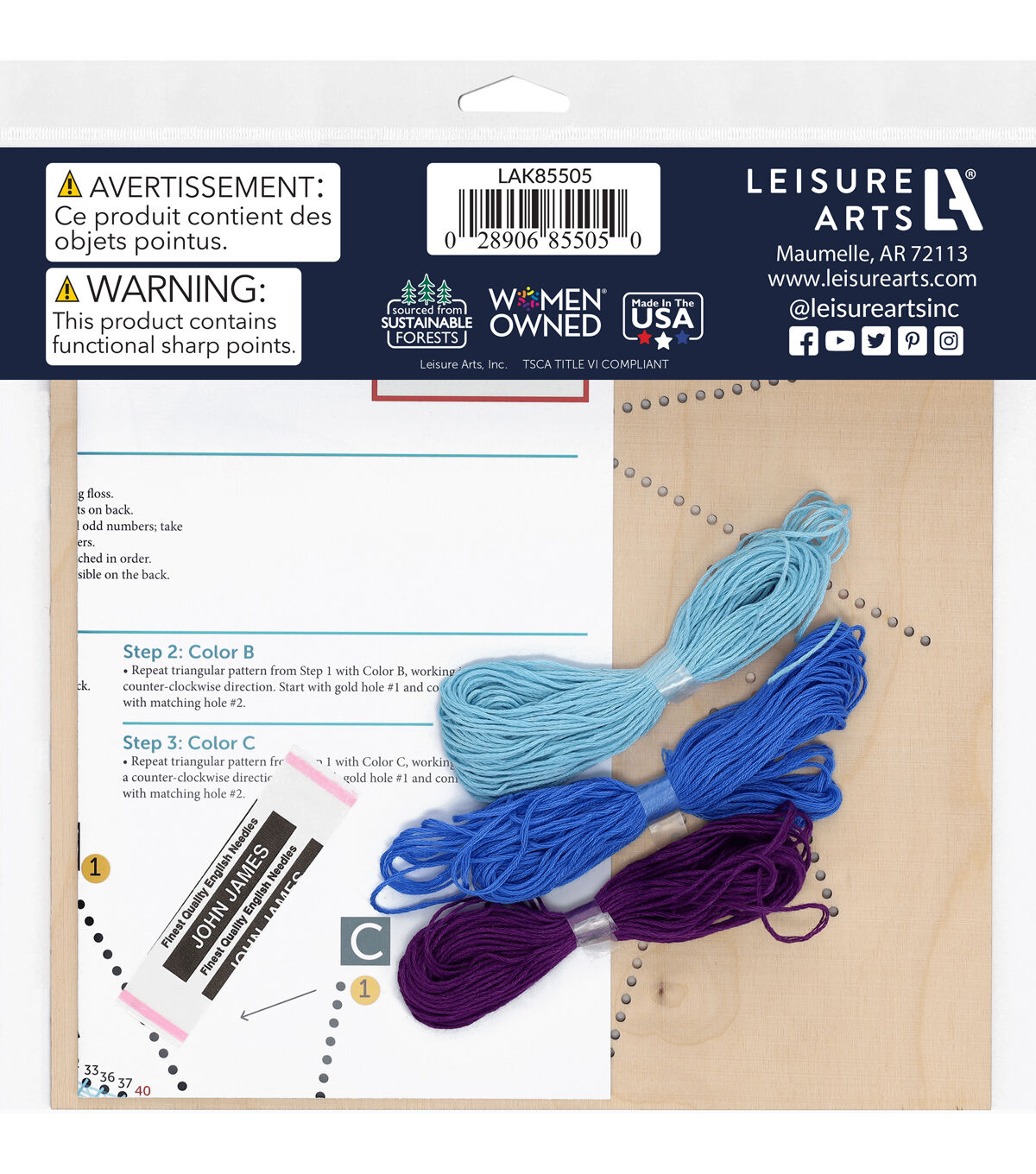 Leisure Arts Kit Wood String Art 9.75"x 9.75" Spiral Panel- Contains: wood stitchery panel, embroidery floss and needle. Includes step-by-step instructions and a guide to straight, stem and backstitch stitches. Follow the color stitch guide or create your own design with the colors provided. Wood panel measures approximately 9.75"x 9.75". Intermediate skill level.